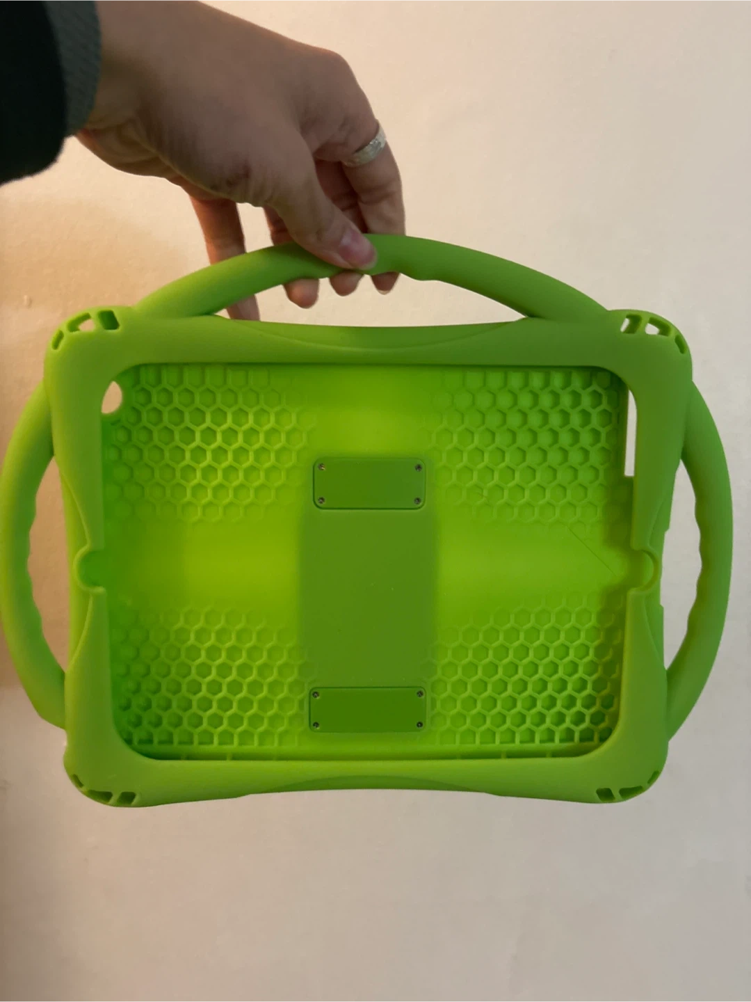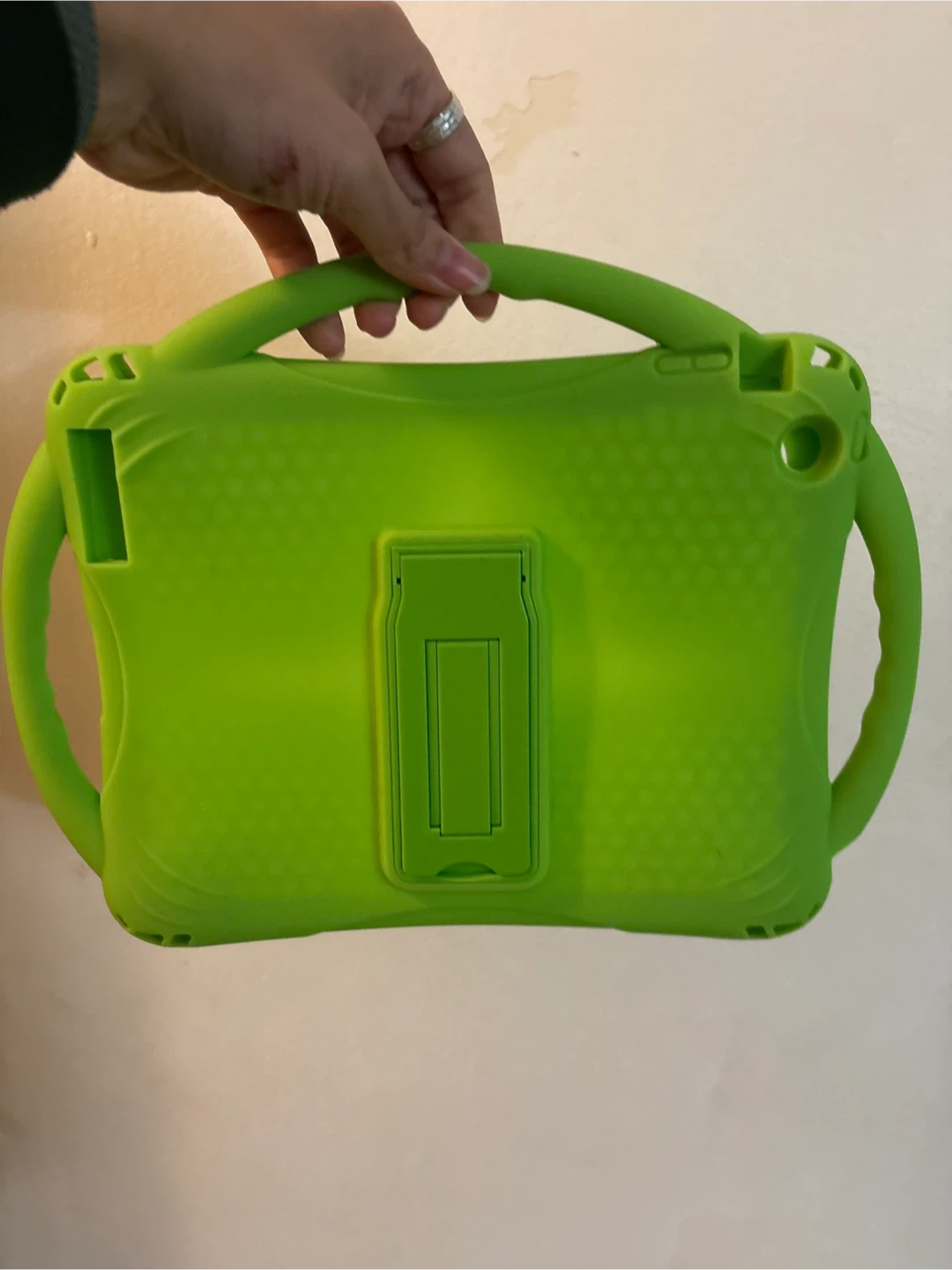This protective tablet case is designed for kids. It's made of durable, shock-absorbent material and features a built-in handle for easy carrying. The integrated stand allows for hands-free viewing. Perfect for protecting tablets from drops and bumps!