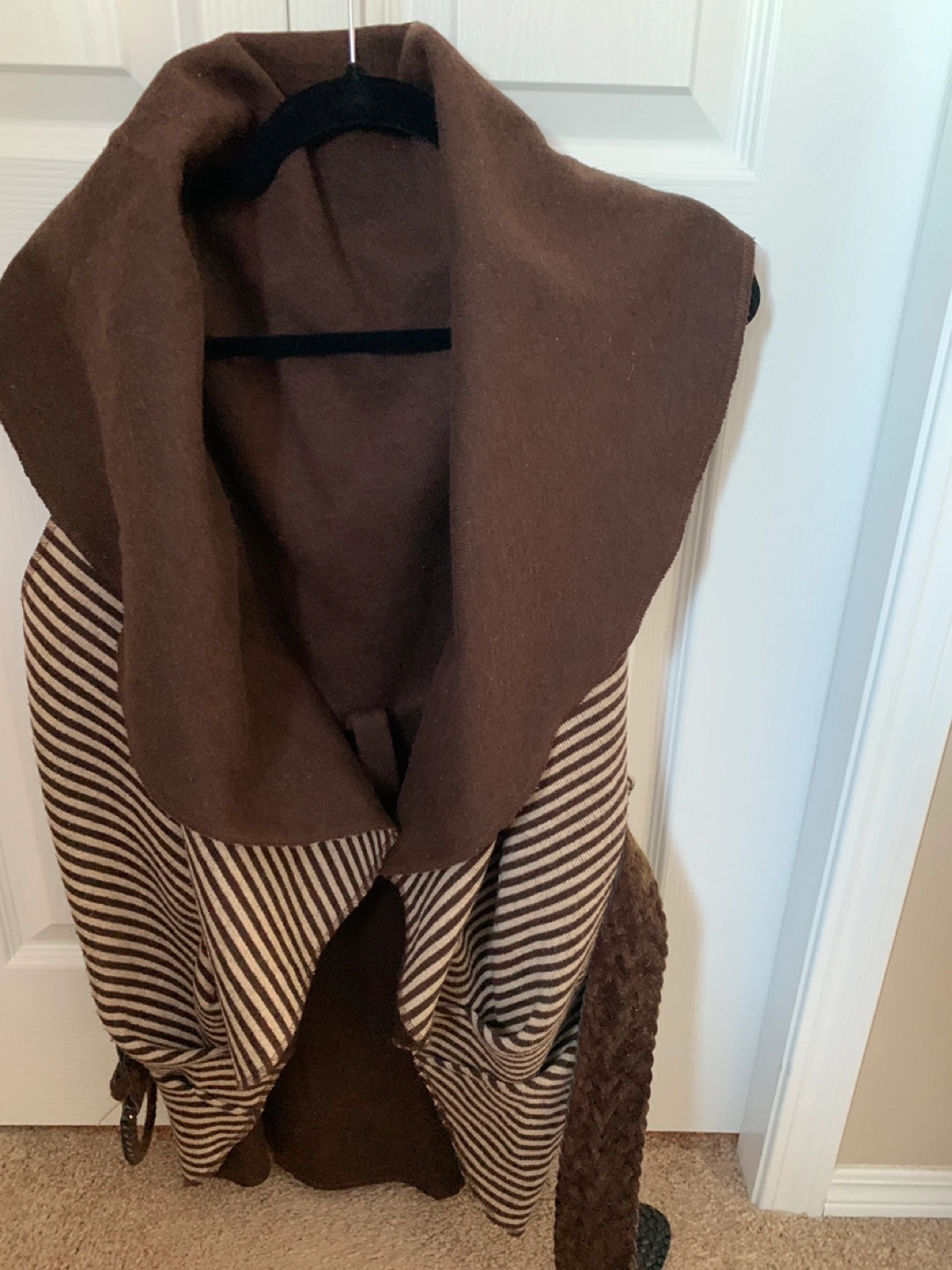 Women's sleeveless cardigan vest. Features a large brown collar and striped beige and brown body. Open front. Relaxed fit.two way to wear and belt leather two way to use too.