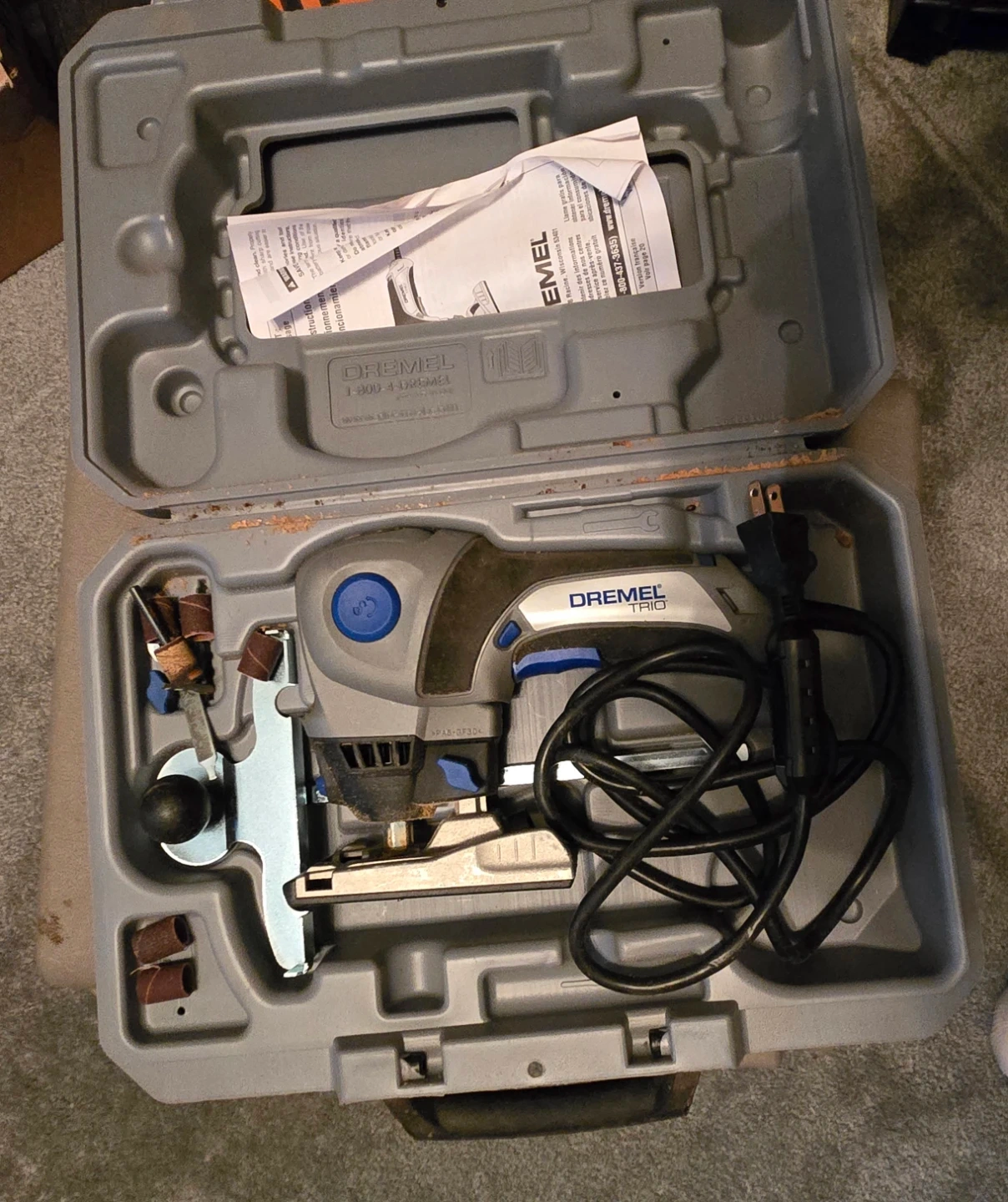 This Dremel Trio is a versatile tool for various crafting and DIY projects. It comes in a durable carrying case with some accessories. It's great for cutting, grinding, and sanding tasks.