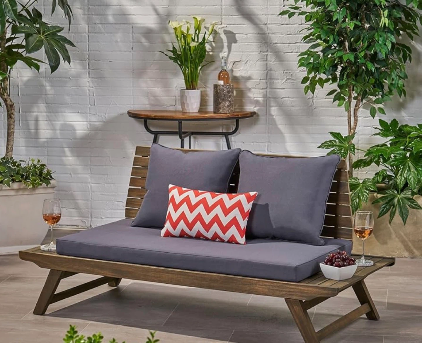 This outdoor wooden loveseat is the perfect addition to your balcony, terrace or backyard. A great place for your morning coffee and a book or your evening drink with a friend.