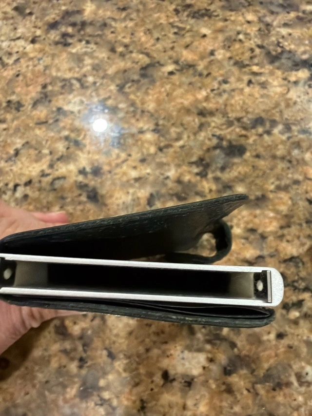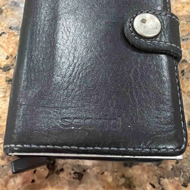 Pre-owned Secrid Miniwallet in Matte Black & Blue. This stylish card wallet is made from leather and aluminum, perfect for holding your cards and cash. It has been used and shows some signs of wear but is still in good, fully functional condition. It can hold up to 10 cards and has a coin pocket. If the ad is up, it's still available!