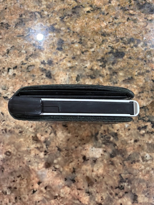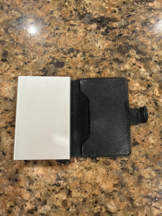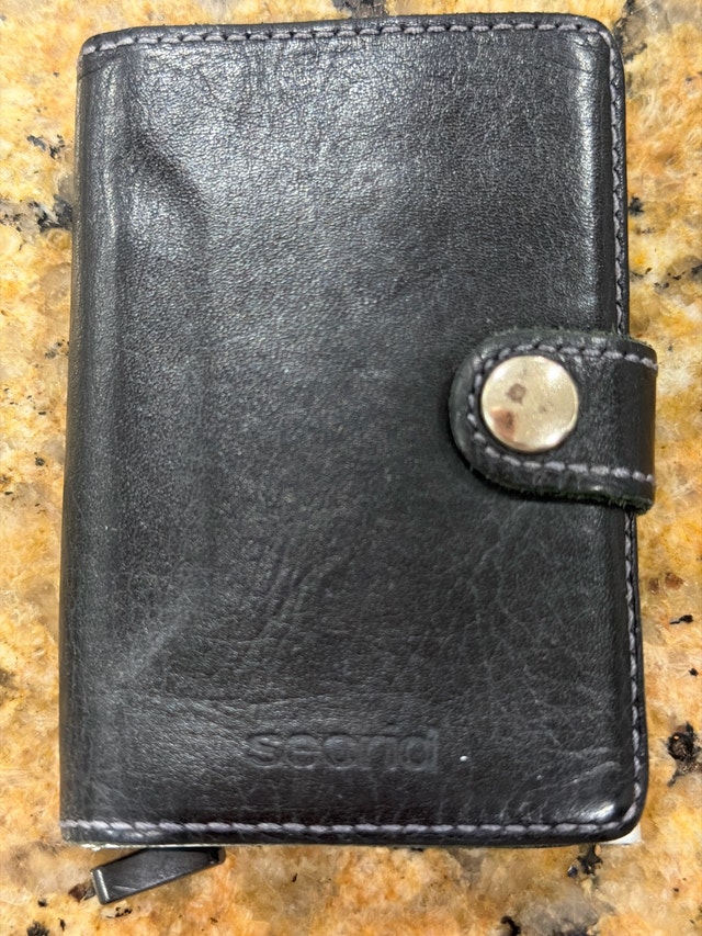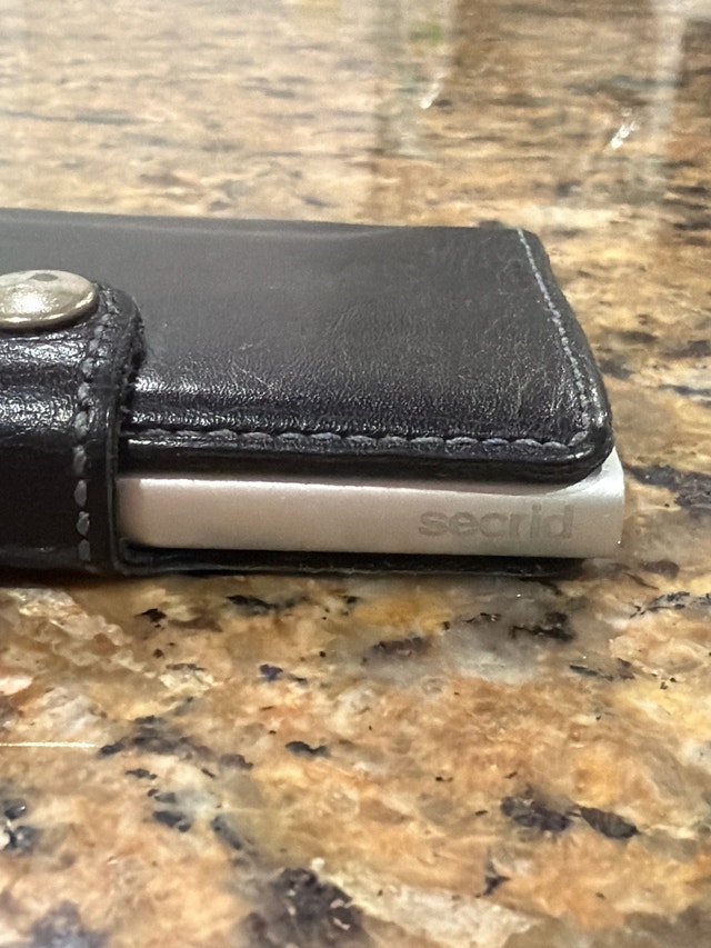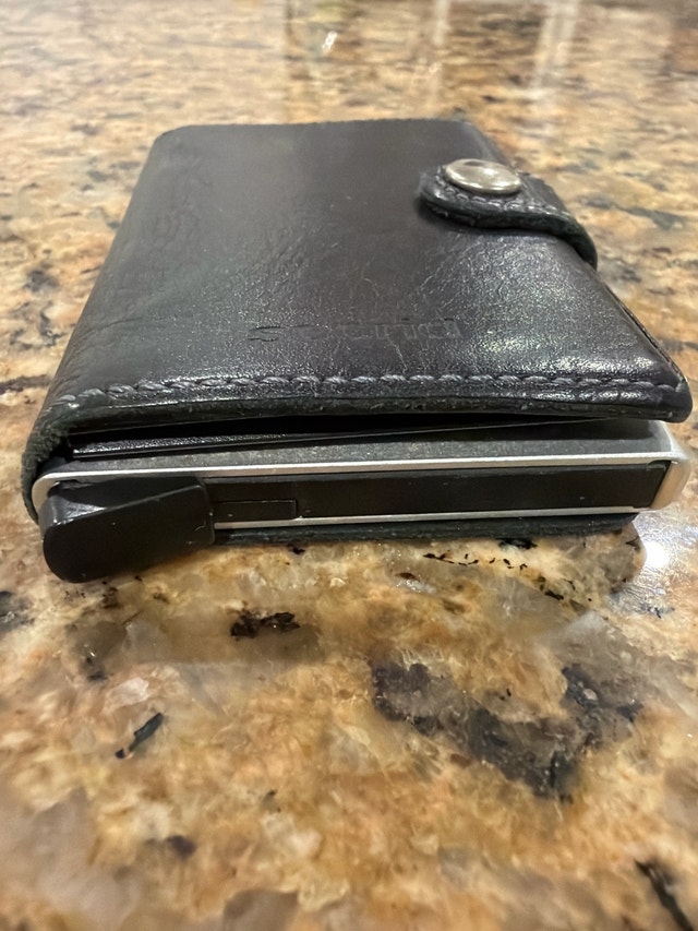 Pre-owned Secrid Miniwallet in Matte Black & Blue. This stylish card wallet is made from leather and aluminum, perfect for holding your cards and cash. It has been used and shows some signs of wear but is still in good, fully functional condition. It can hold up to 10 cards and has a coin pocket. If the ad is up, it's still available!