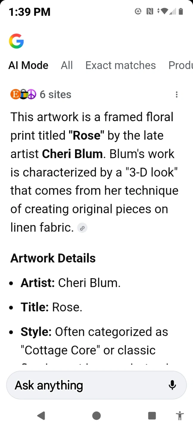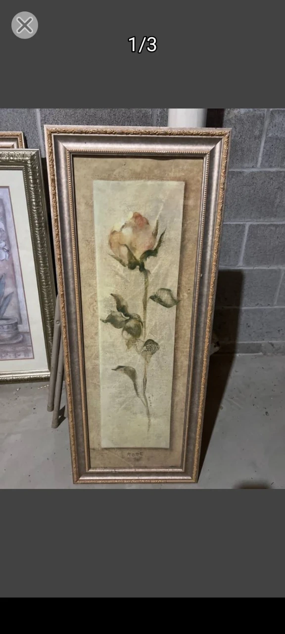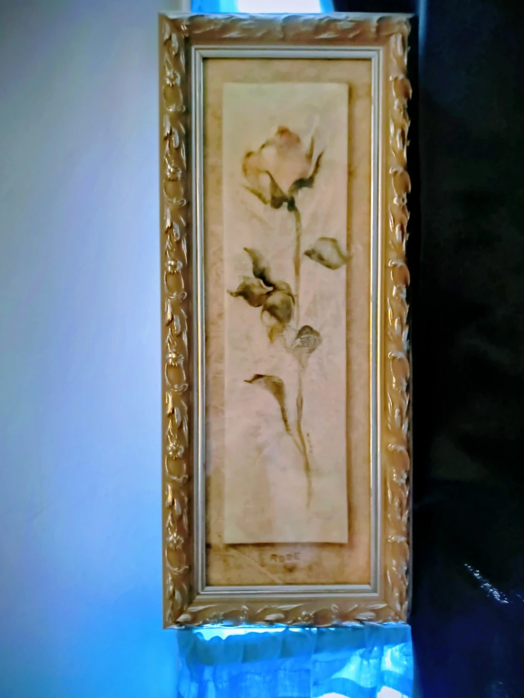 This artwork is a framed floral print titled "Rose" by Cheri Blum. It's presented on a linen fabric with a unique 3-D appearance. The piece is encased in an ornate, textured gold frame.