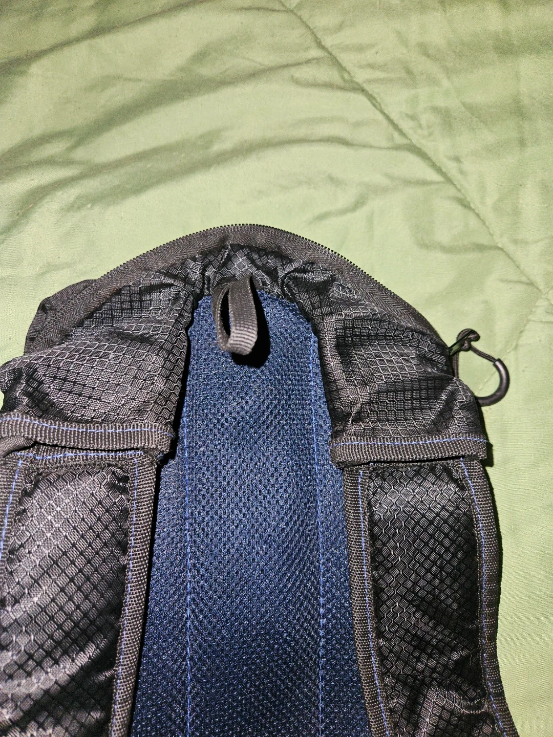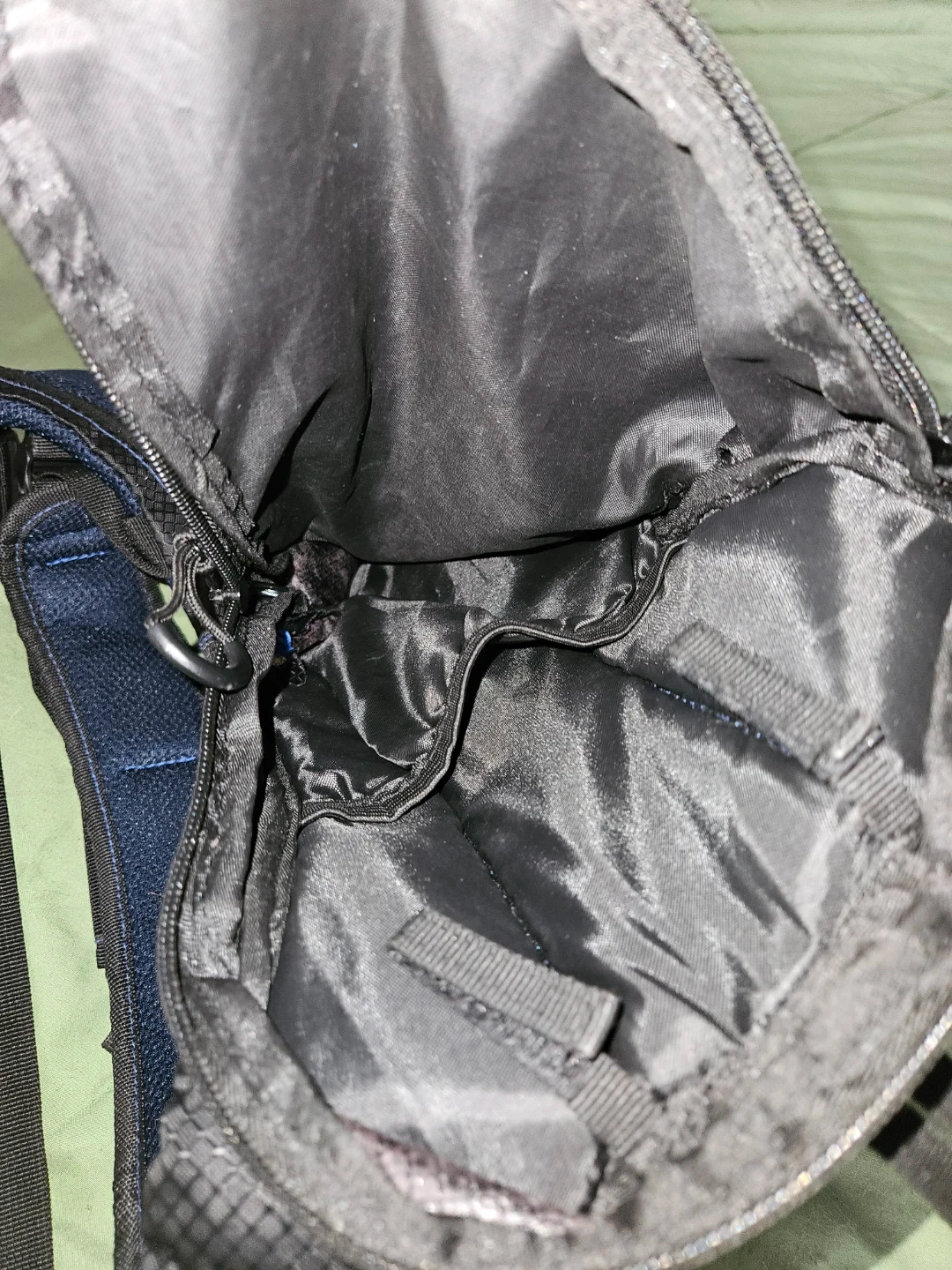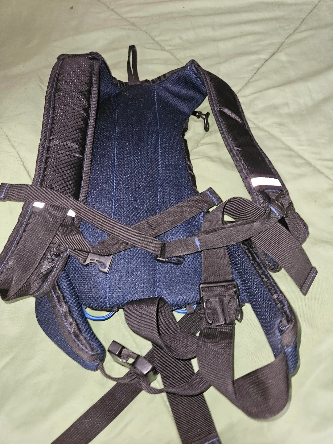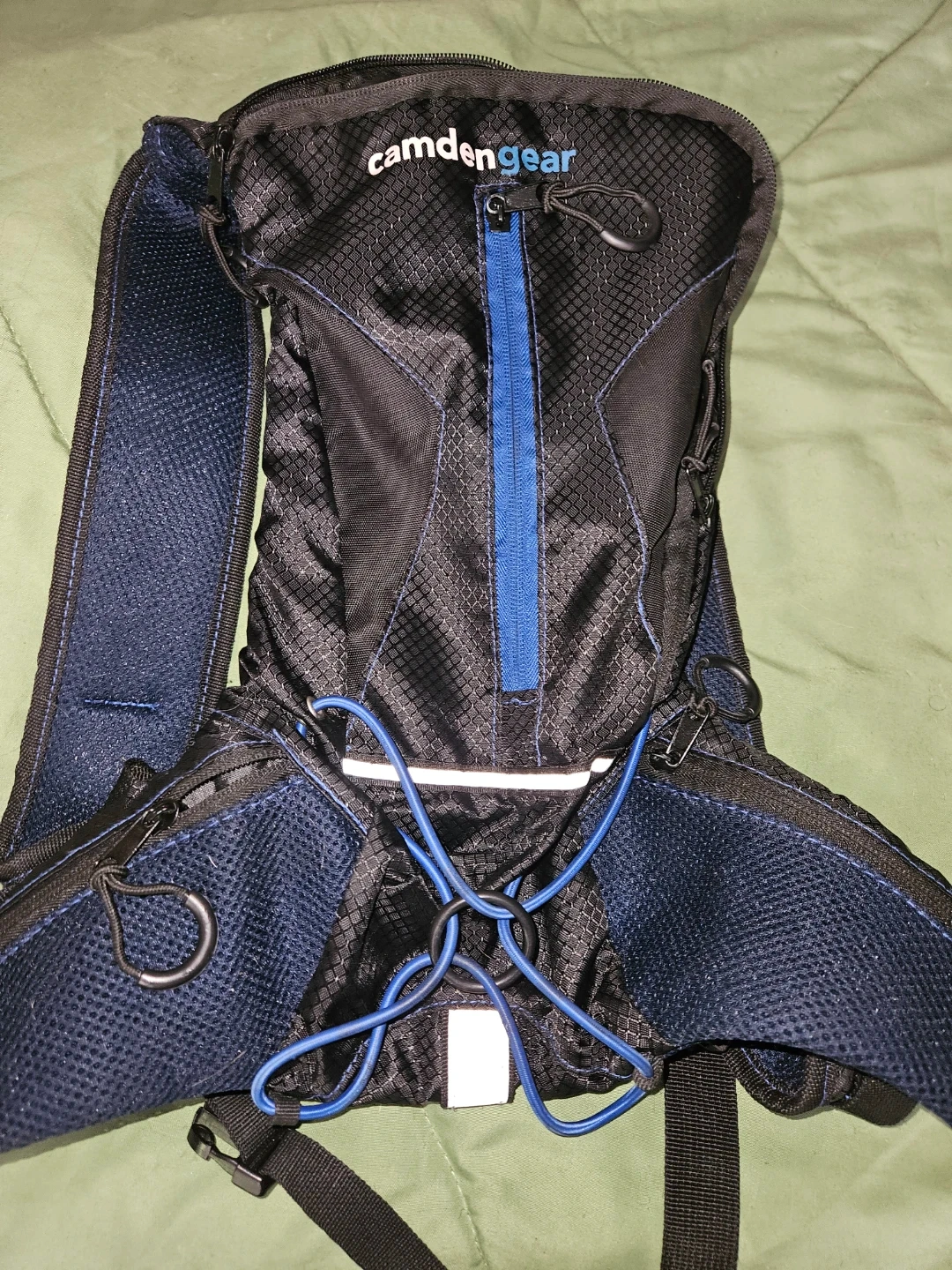This black and blue CamdenGear hydration backpack is designed for outdoor activities. It features adjustable straps and multiple compartments for storage. The mesh back panel ensures breathability.