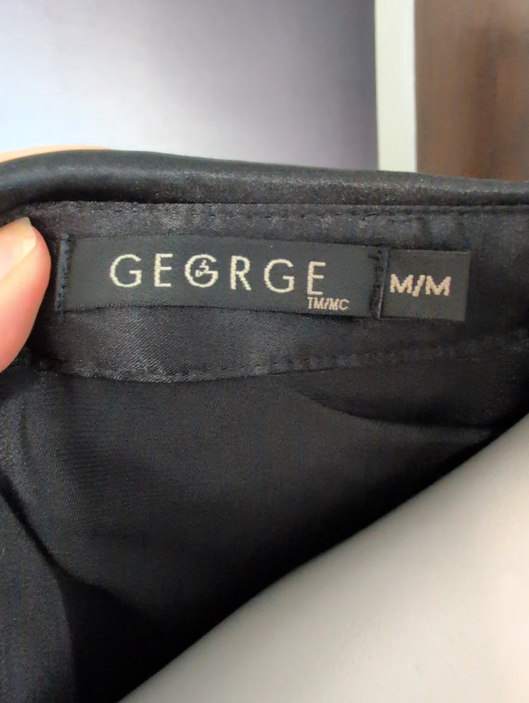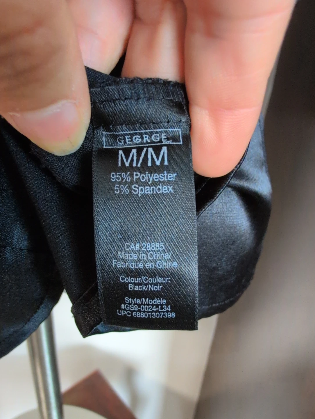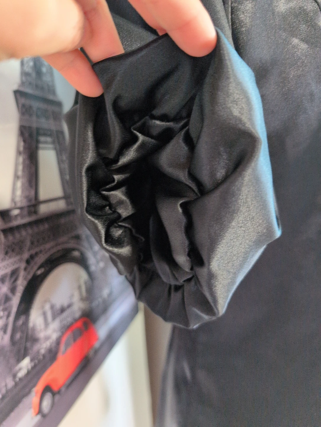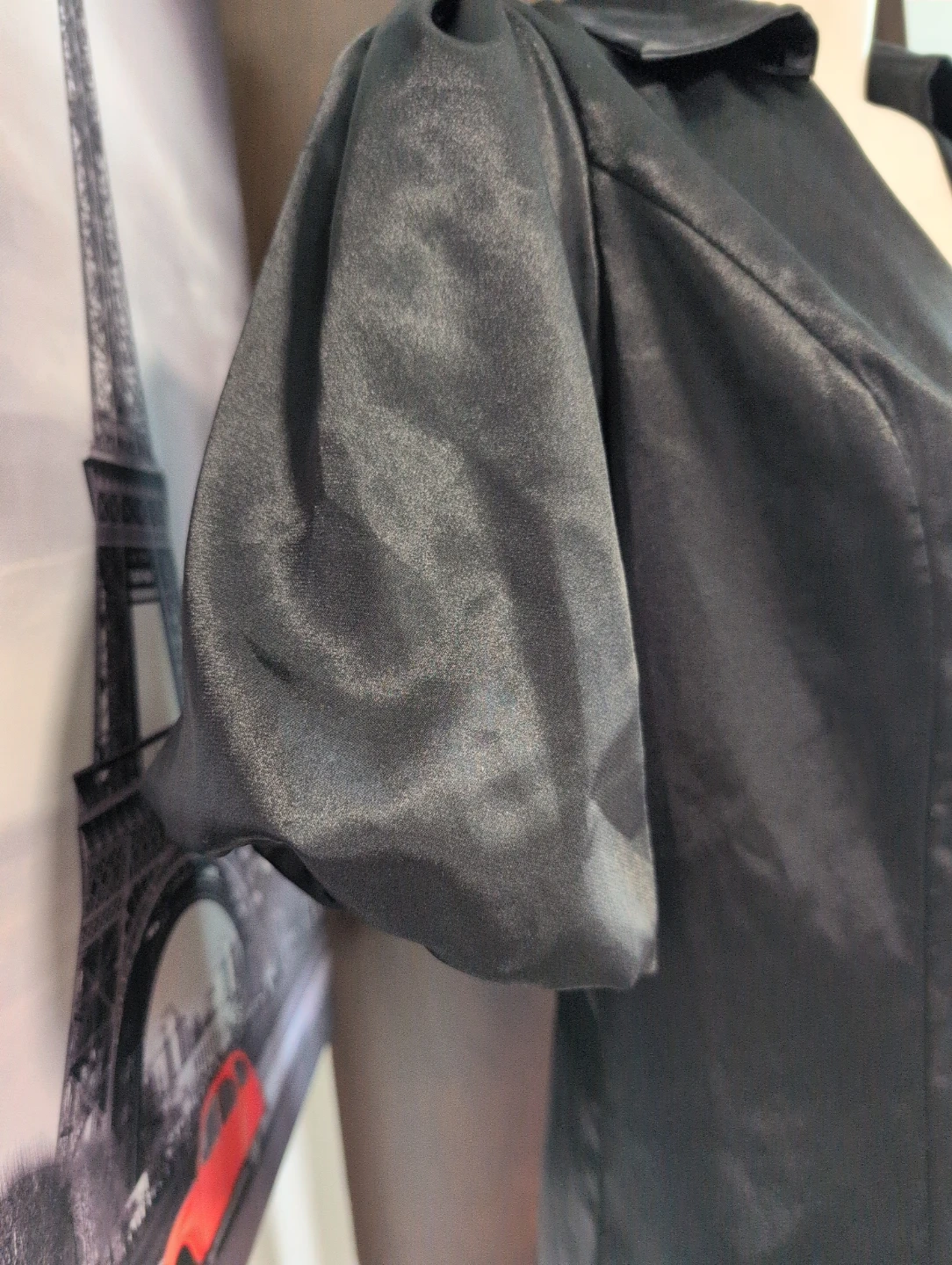 This black blouse features a V-neck collar and a button-up front. It's made of a shiny satin material with short puff sleeves. The material is polyester.