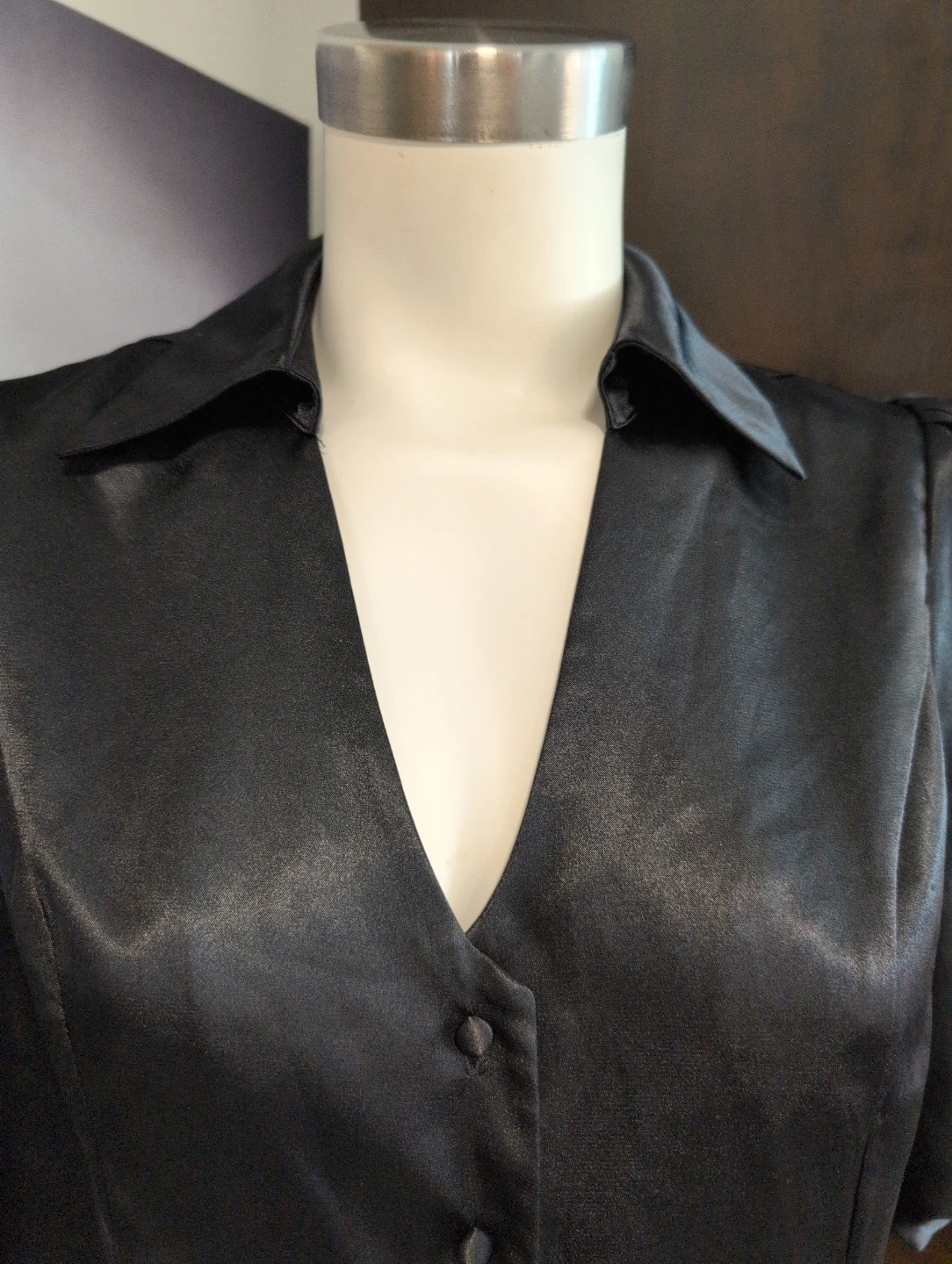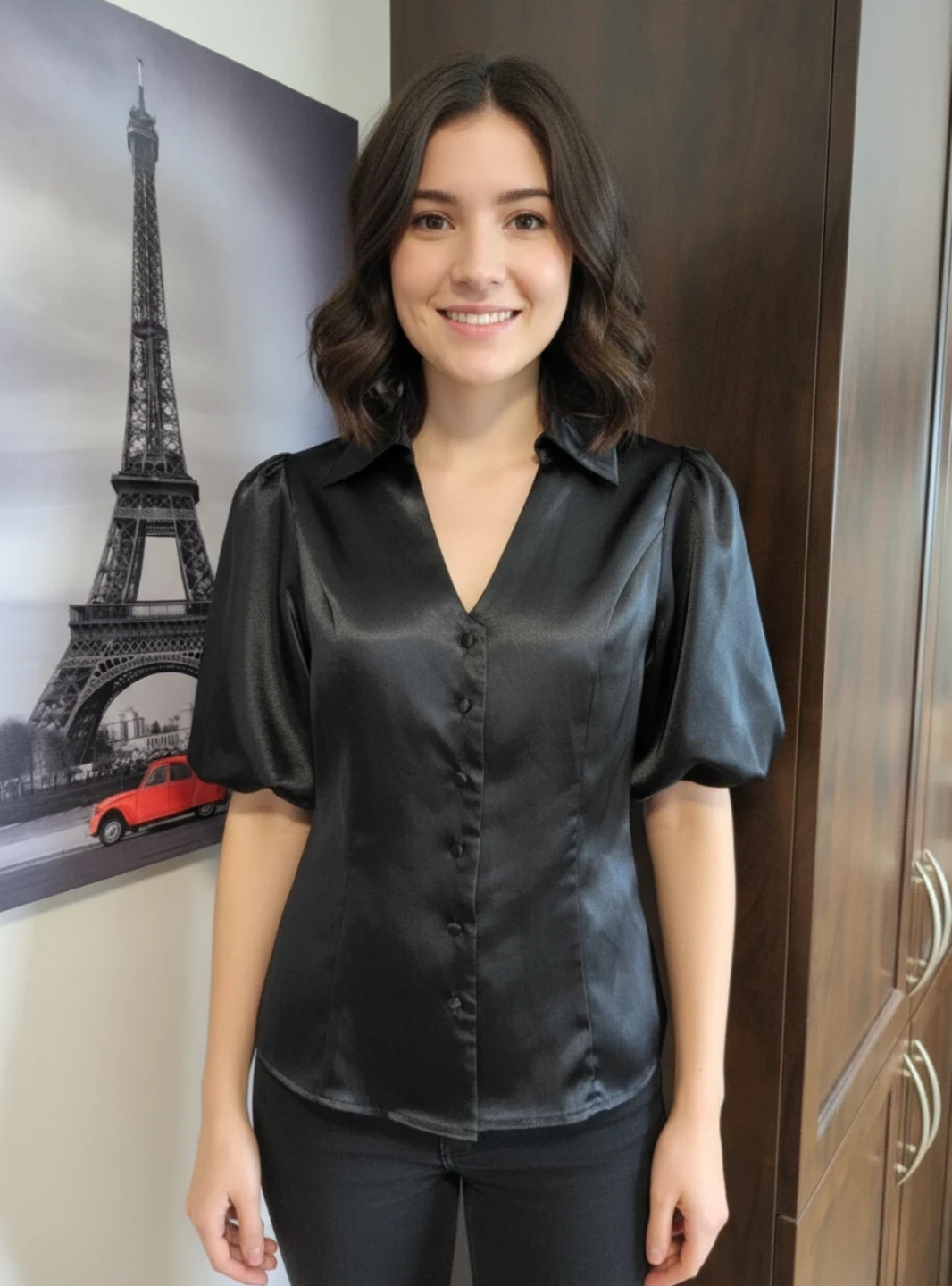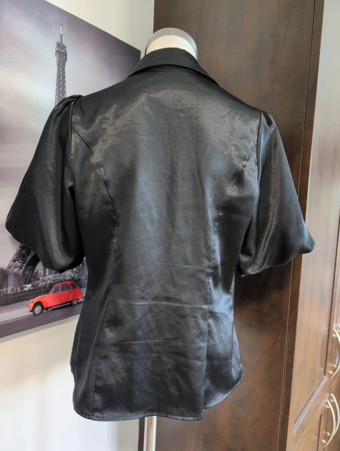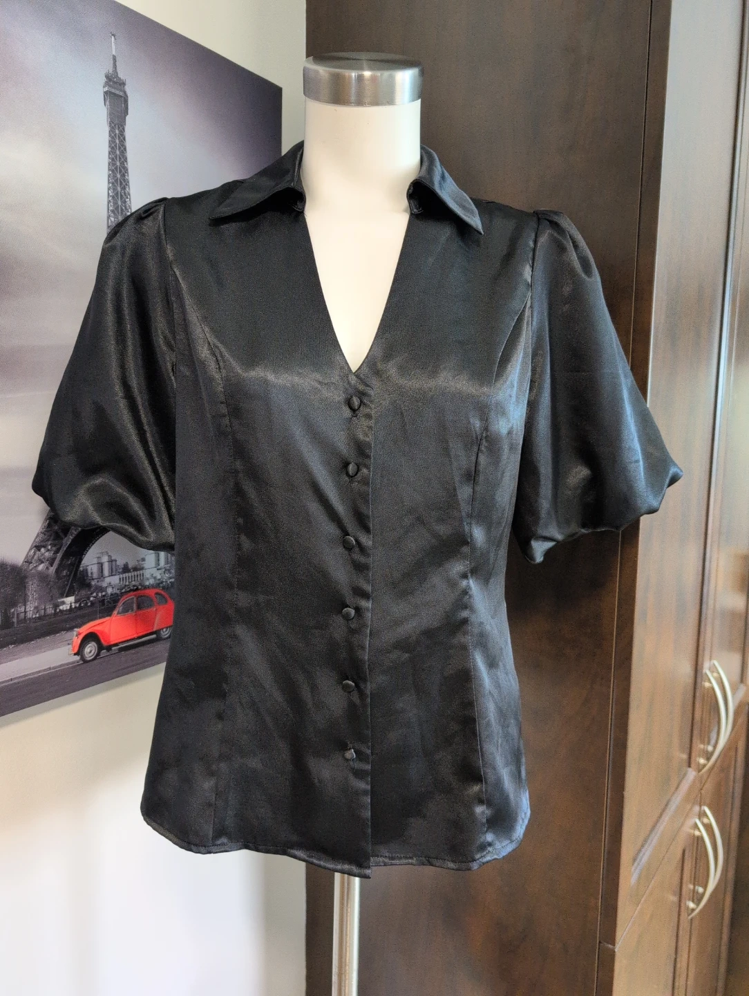 This black blouse features a V-neck collar and a button-up front. It's made of a shiny satin material with short puff sleeves. The material is polyester.