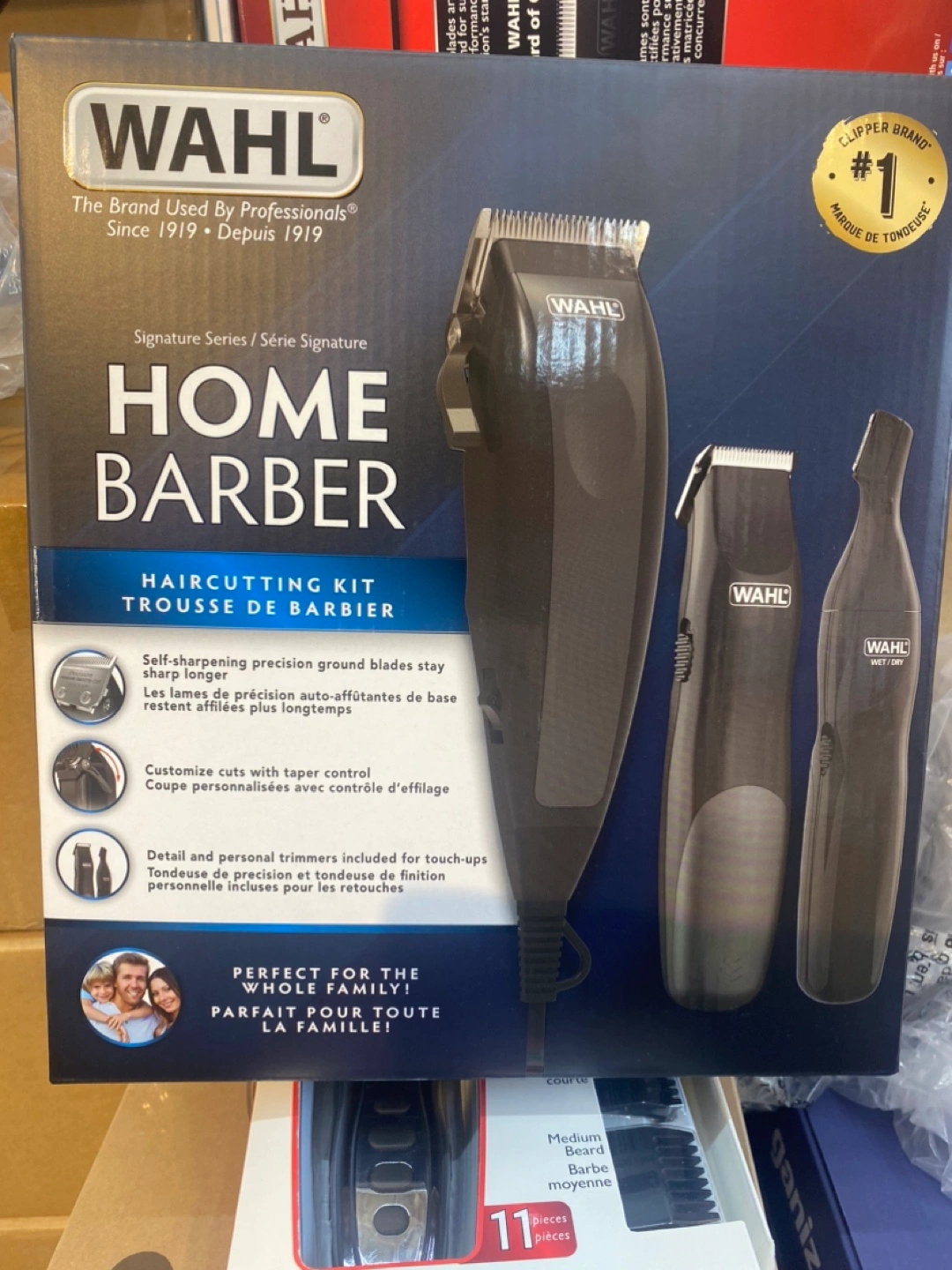 Wahl home barber kit. Includes clippers and detail trimmers. Perfect for the whole family. Self-sharpening blades. Taper control for customized cuts.