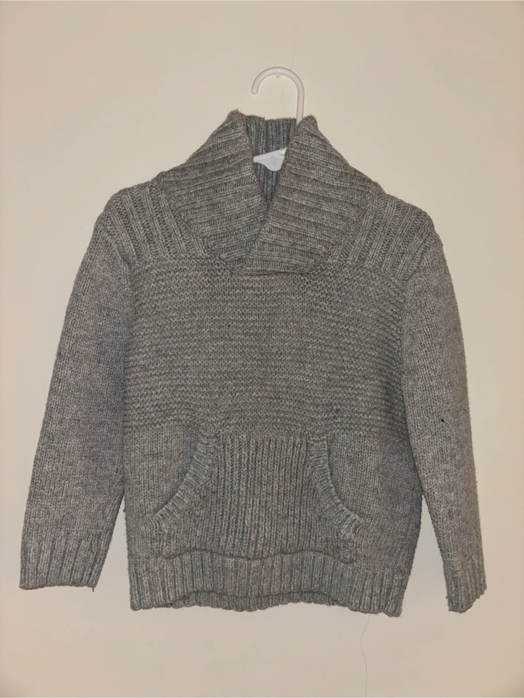 This boys' gray knit sweater features a cozy shawl collar and a convenient front pouch pocket. It's made from a soft, textured yarn for warmth. Ribbed cuffs and hem.