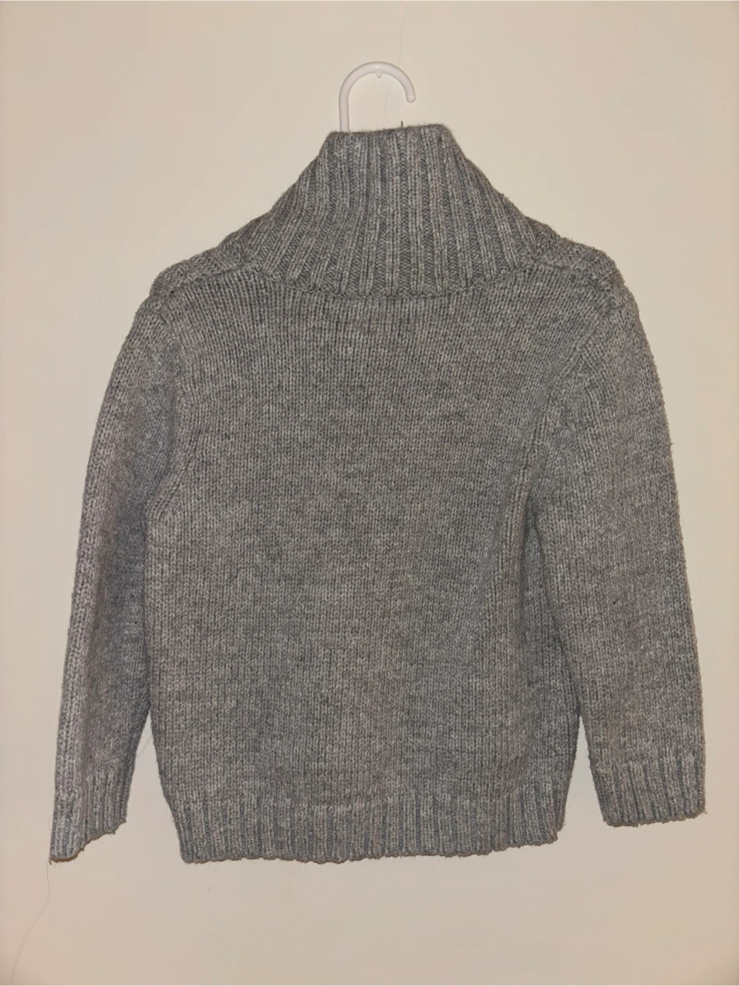 This boys' gray knit sweater features a cozy shawl collar and a convenient front pouch pocket. It's made from a soft, textured yarn for warmth. Ribbed cuffs and hem.