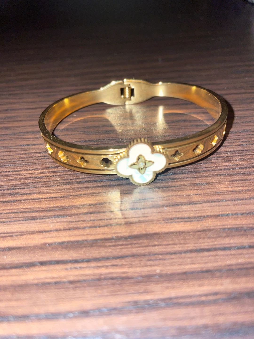 Selling a lovely gold-tone bangle bracelet. It features a pretty clover design. Perfect for adding a touch of elegance to any outfit!