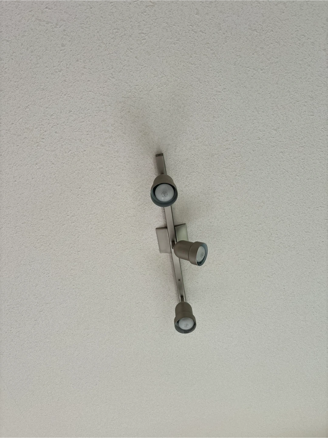 This is a brushed nickel track lighting fixture with three adjustable spotlights. It's a simple and functional way to add light to any room. The fixture is made of metal.