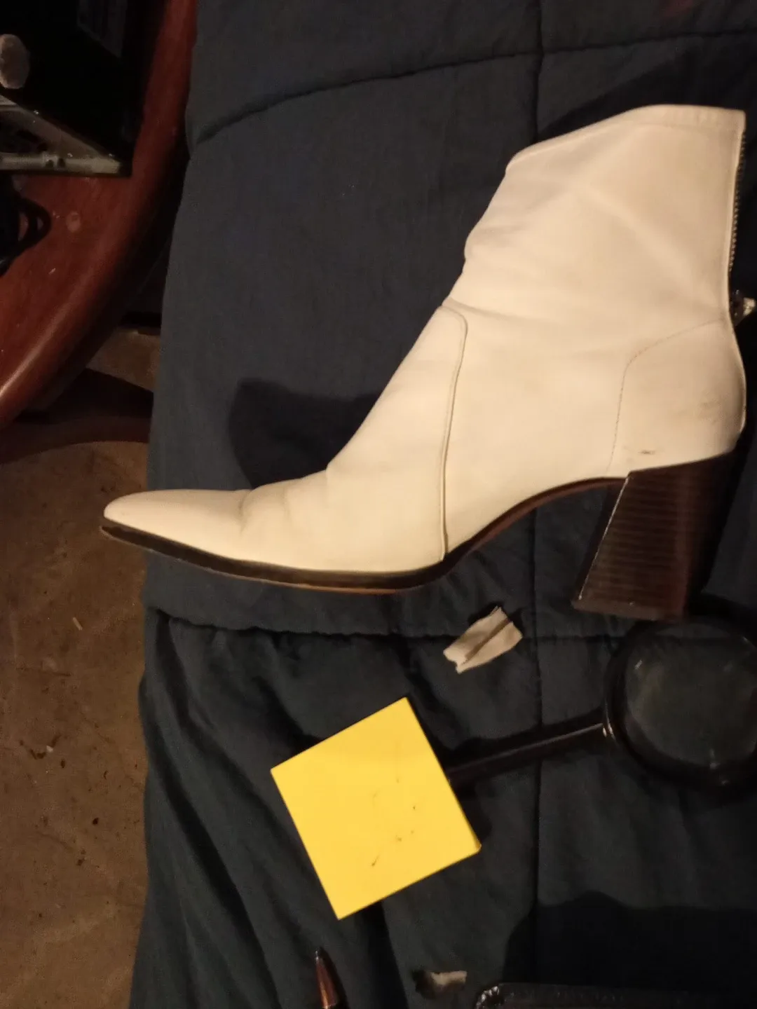 Stylish white ankle boots with a side zipper. These boots have a pointed toe and a stacked heel. Perfect for adding a chic touch to any outfit!