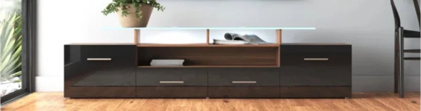 Selling a modern TV stand/media console. It features a sleek design with a combination of dark and wood-tone finishes. The unit has multiple drawers and open shelving for storage and display. It's perfect for organizing your media equipment and accessories while adding a stylish touch to your living room