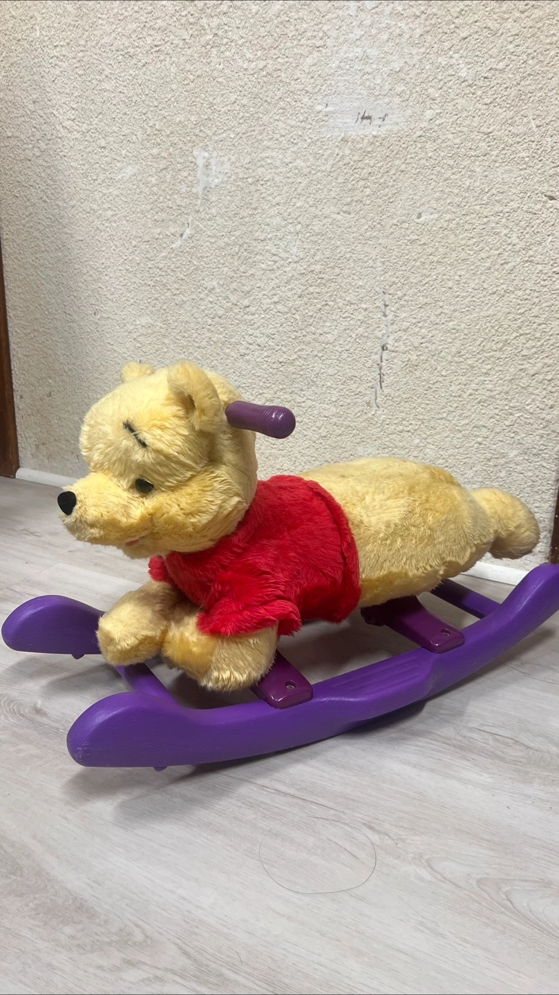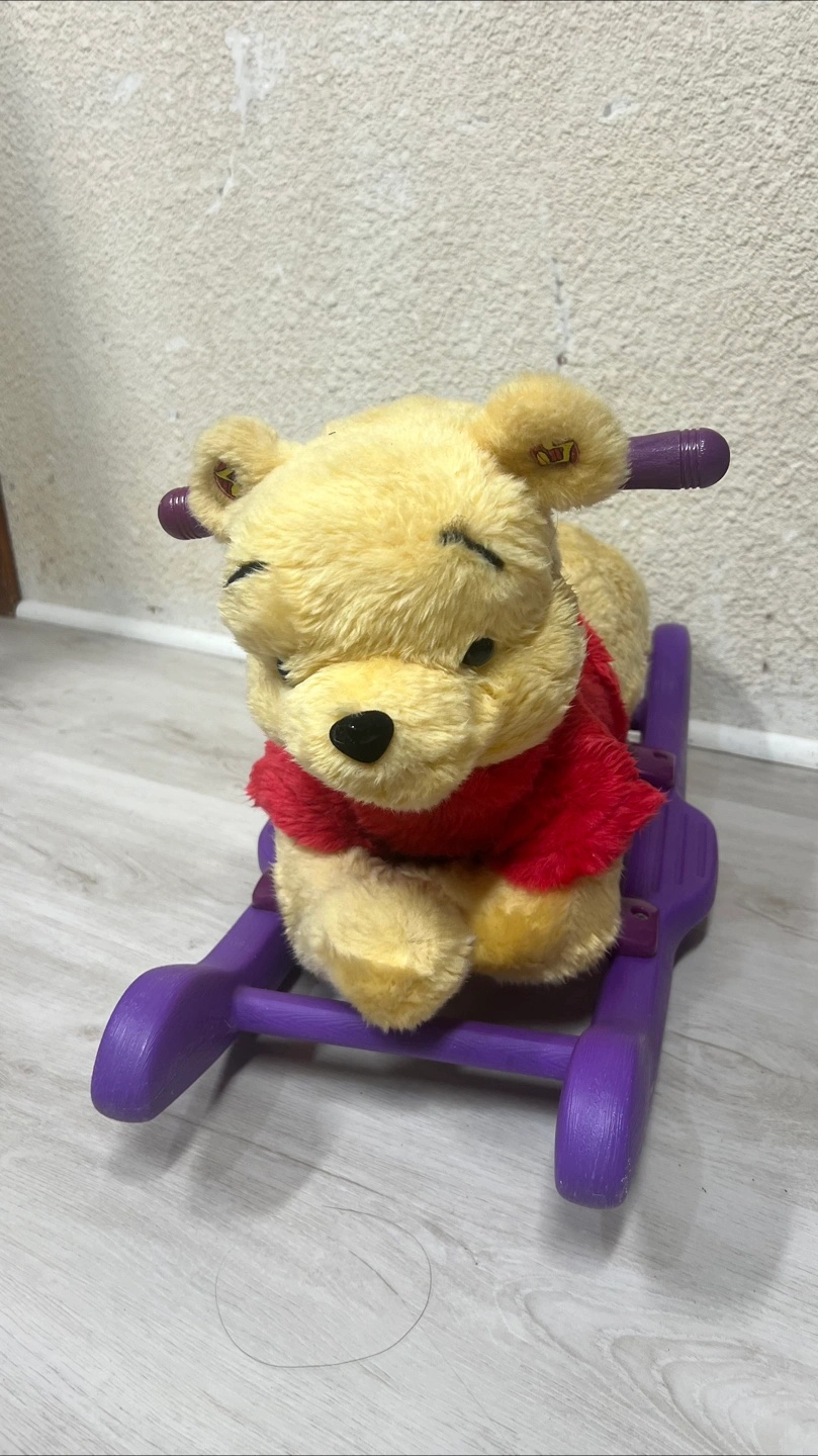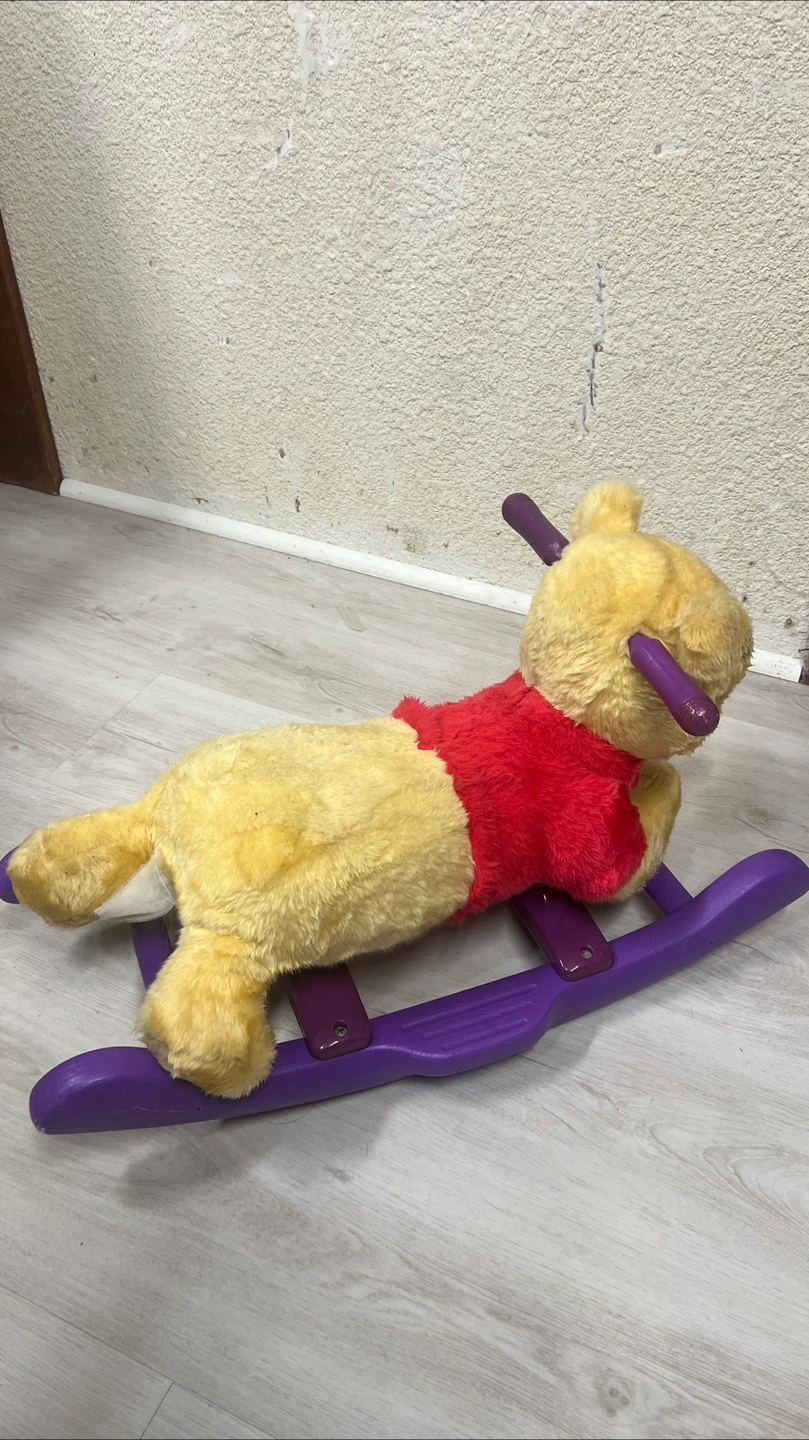 Adorable Winnie the Pooh rocking animal. Plush Winnie the Pooh design. Purple plastic rocker base. Suitable for toddlers. Gently used.
