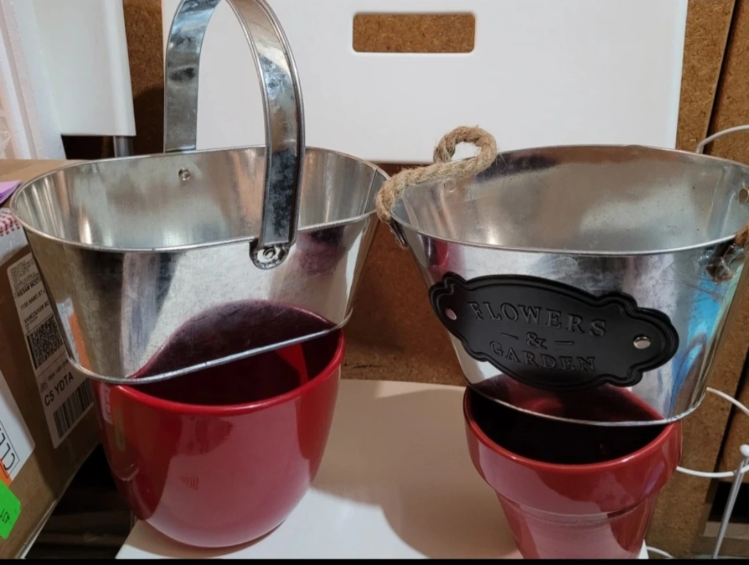 5 items, 2 galvanized metal planters, one with a handle and rope accents, and the other featuring a "Flowers & Garden" plaque, 2 red flower pots, and 1 black metal butterfly-shaped plant stand. Ideal for small plants or decorative displays. Great for your garden or windowsill. Happy planting!