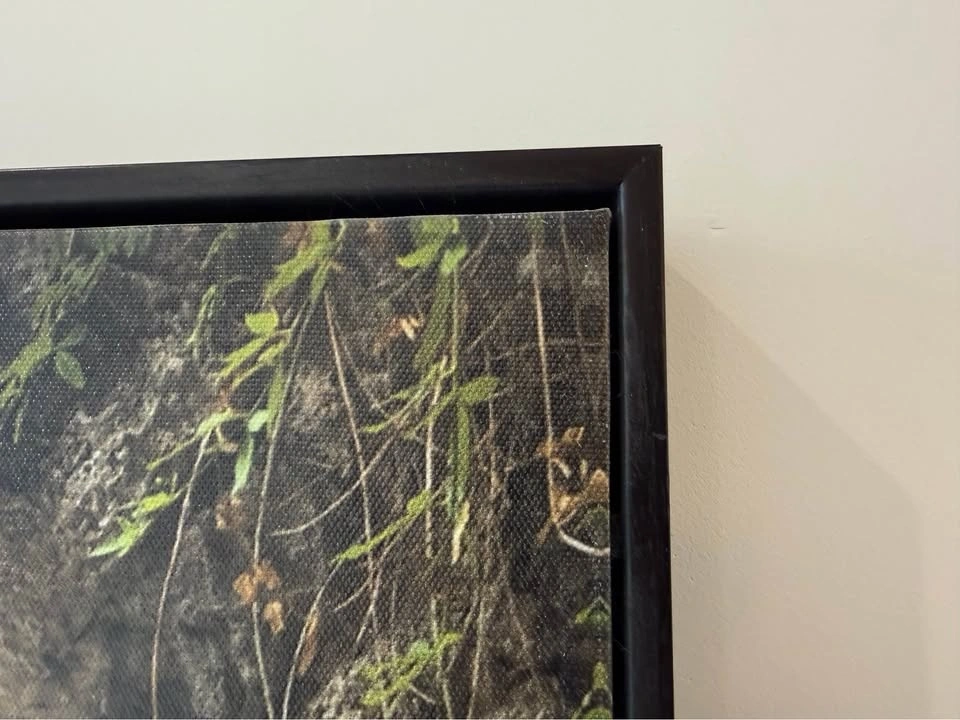 Beautiful framed canvas art print with a scene of an arched pathway and lots of greenery. The black frame is sleek. Great for adding some charm to your space. Dimensions: 25” W x 37” H x 1.5”D.
