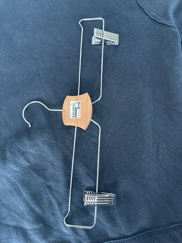 Selling 9 Ikea skirt hangers, perfect for keeping skirts and trousers neat and tidy. These used hangers are in good condition and ready for a new home. They feature a sturdy metal frame with wooden details and clip closures to prevent clothing from slipping. Cash accepted.
