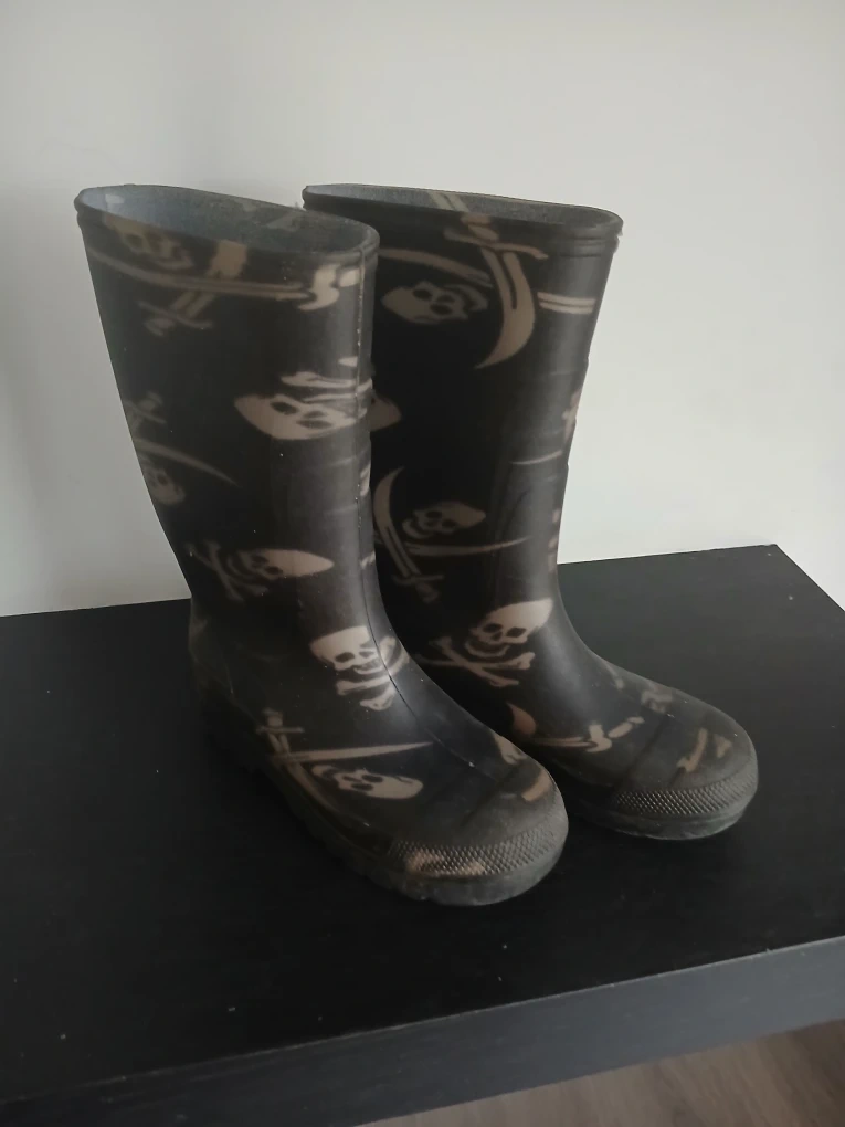 These adorable rain boots feature a fun pirate print! They're perfect for splashing in puddles on rainy days. They show some signs of use but still have lots of life left in them for your little one's adventures . Size 2