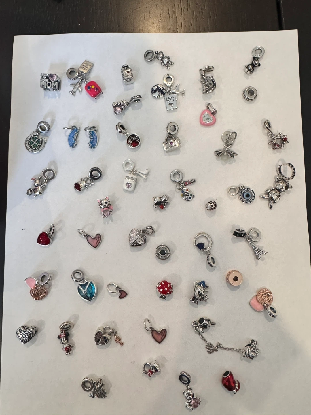Collection of various metal charms for bracelets. Designs include travel, hearts, animals, and Disney characters. Most appear to be silver925