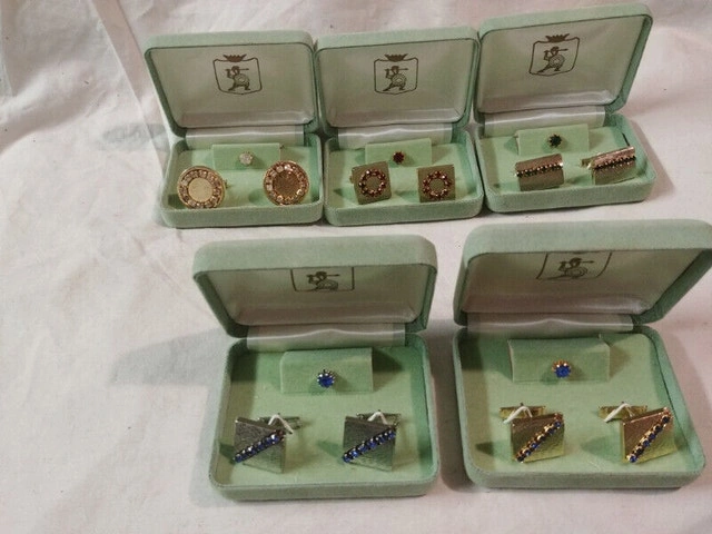 Up for sale we have 5 New Vintage set of Cufflink and Tie Pin there is 2 set of Blue glass crystal 1 set is goldtone and 1 on silvertone also all 3 set in goldtone , 1 set green glass crystal one set with red glass crystal and one set with white glass crystal all in there metal cases and in new mint condition