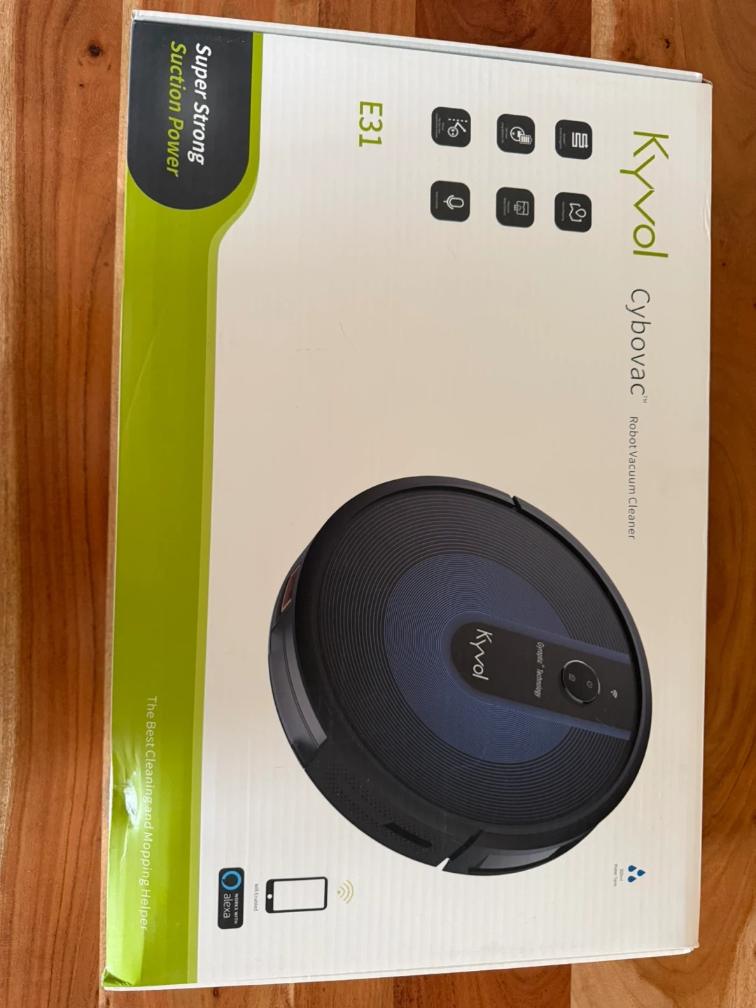 Kyvol Cybovac E31 robot vacuum cleaner. Includes charging base and remote. Features Gyroptic Technology for efficient cleaning. Super strong suction power! Used only a few times, original purchased for $350, includes a mop attachment and is in great condition.
