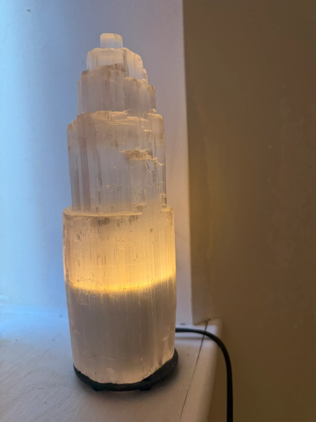 Selling a Selenite Tower Lamp! It's in great condition and gives off a beautiful, soft light. Perfect for creating a calming atmosphere in any room. The stone can be removed from the light.