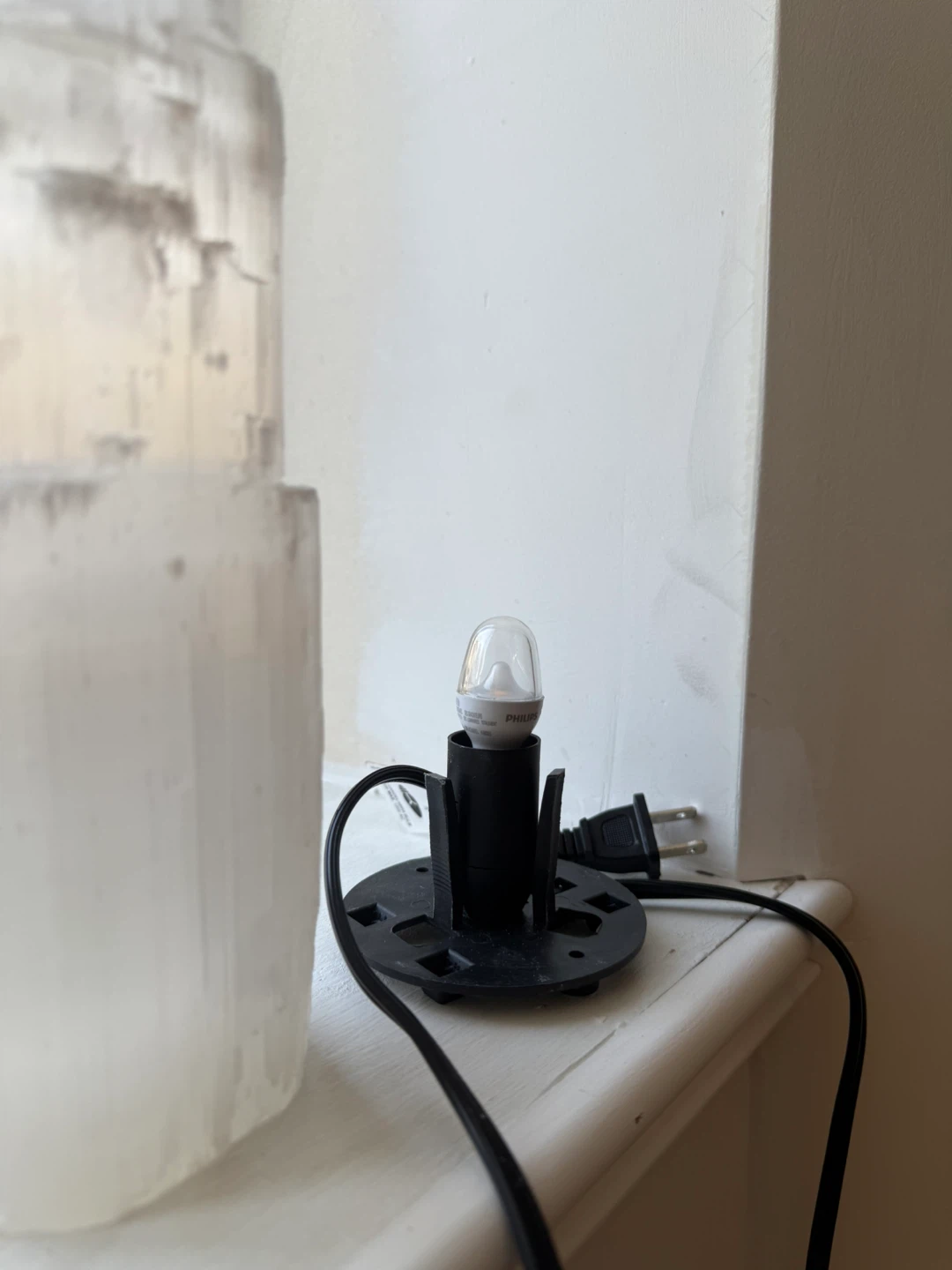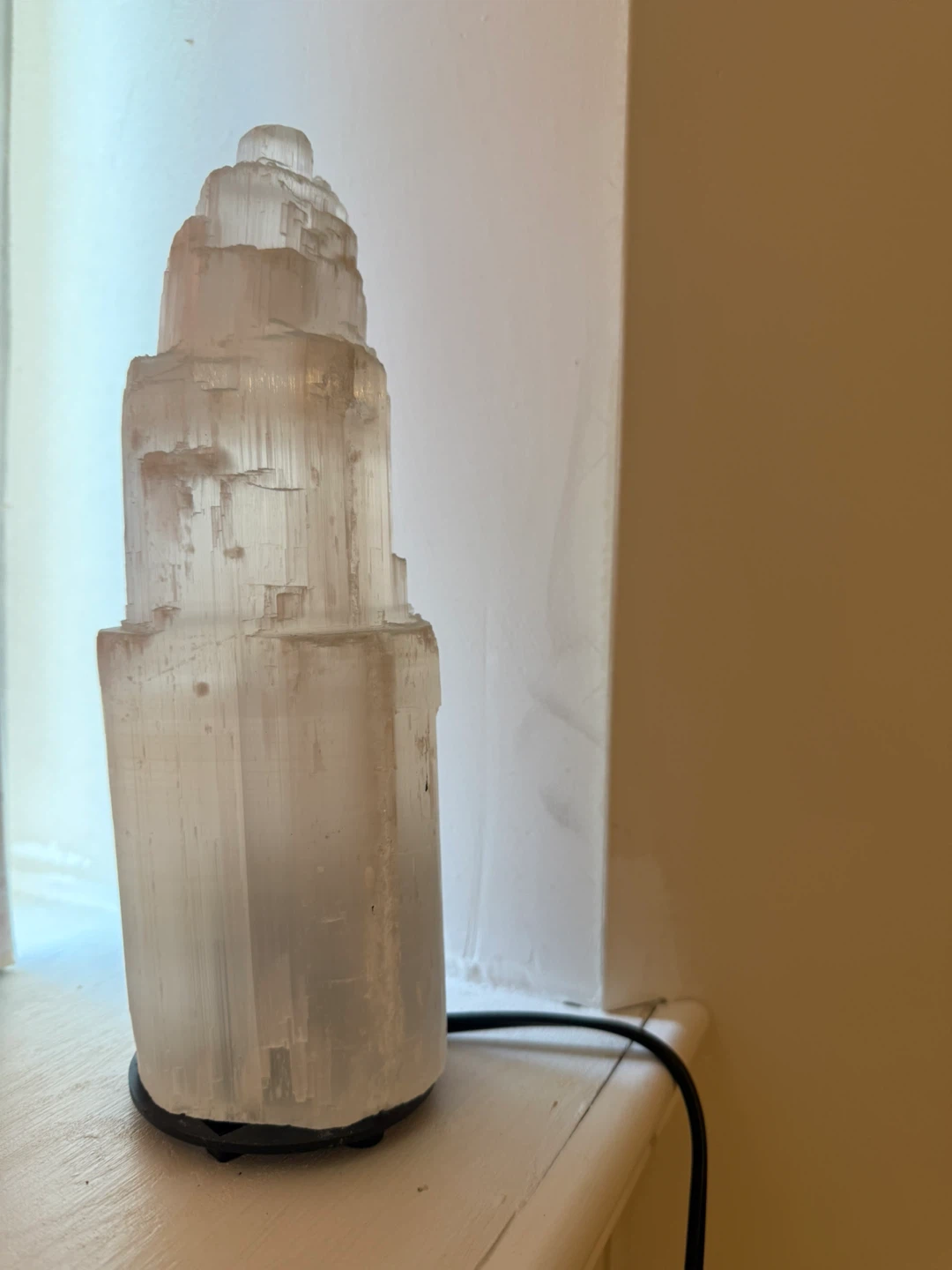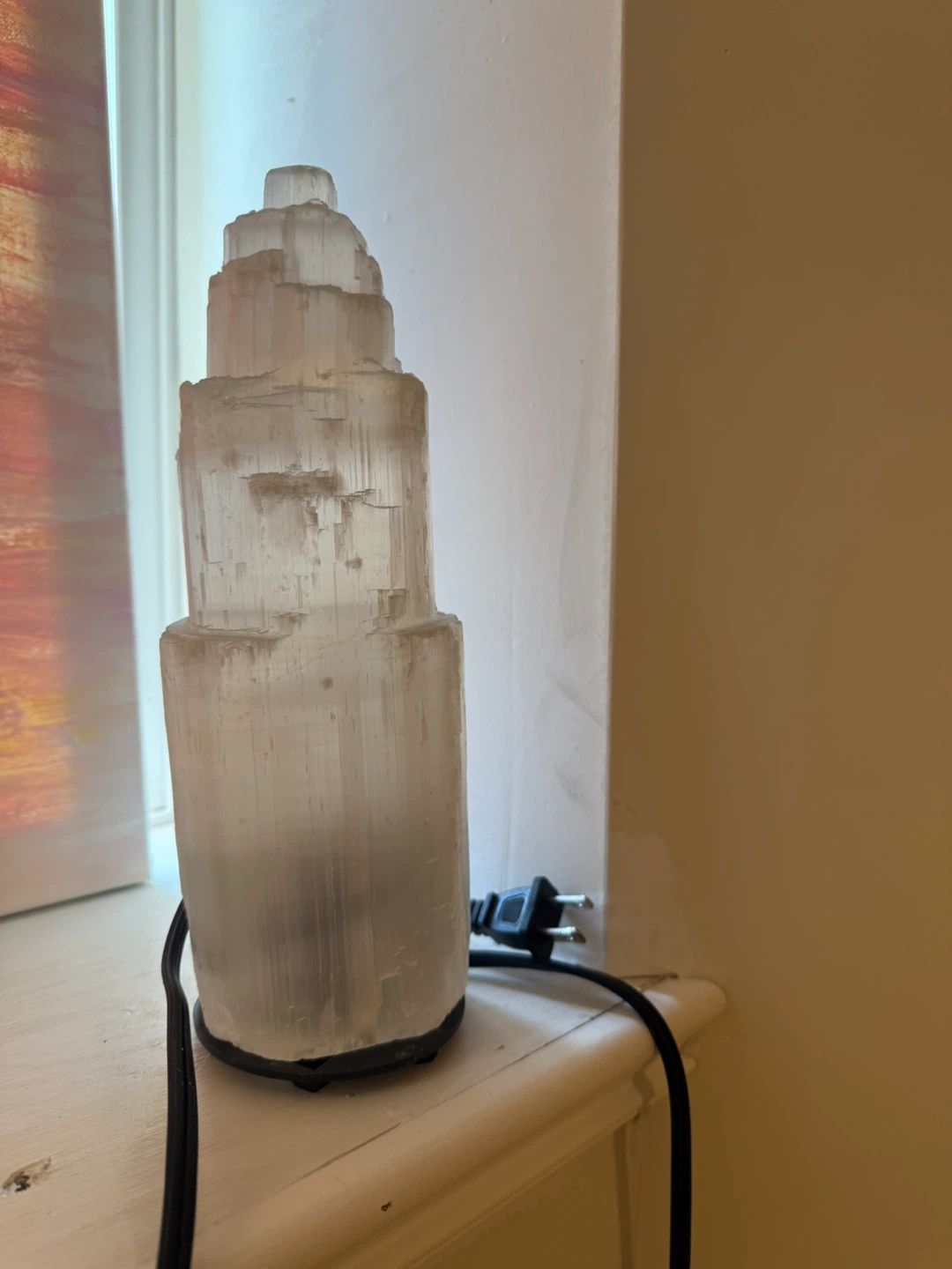 Selling a Selenite Tower Lamp! It's in great condition and gives off a beautiful, soft light. Perfect for creating a calming atmosphere in any room. The stone can be removed from the light.
