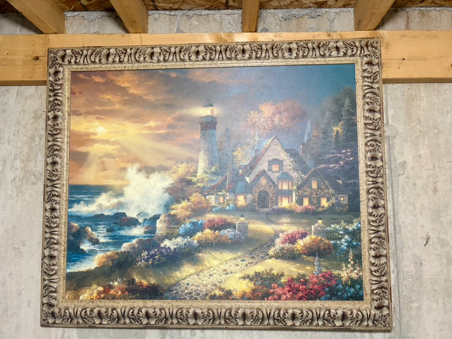 Beautiful framed painting of a lighthouse scene with a cottage and vibrant floral garden. The artwork depicts a dramatic coastal landscape with crashing waves. It's ready to hang and would complement any home decor.