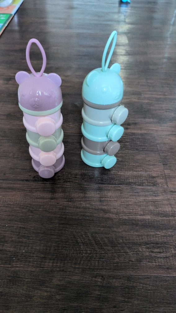 Two baby formula dispensers. Features a bear design at the top. Multiple compartments and lids on the side. Perfect for parents on the go.