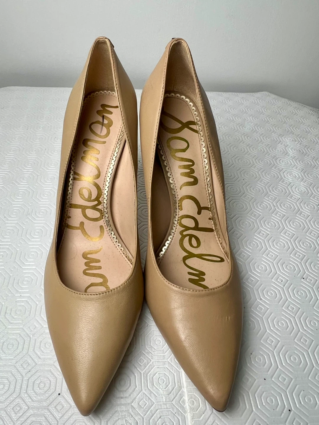Classic tan leather pumps by Sam Edelman. These stylish heels are made from genuine leather and feature a pointed toe with a stiletto heel. They're perfect for dressing up any outfit!