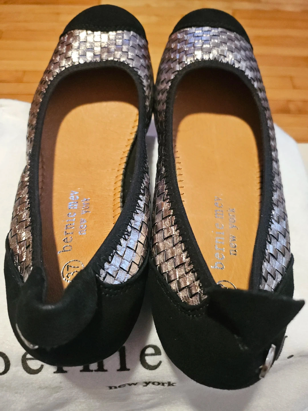 Bernie Mev. New York woven ballet flats in silver and black. These slip-on shoes have a woven metallic toe box and a black suede-like cap toe and heel. Comfortable and stylish for everyday wear!