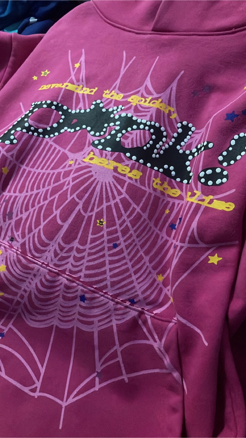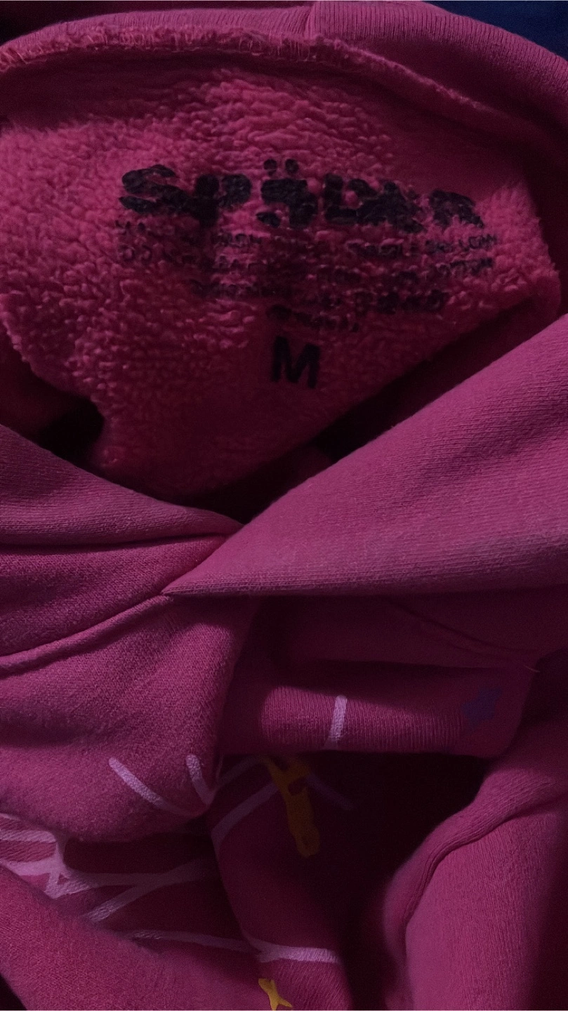 Selling a SP5DER pink hoodie in size M.There is a small tear on the bottom it’s easy you could restich it