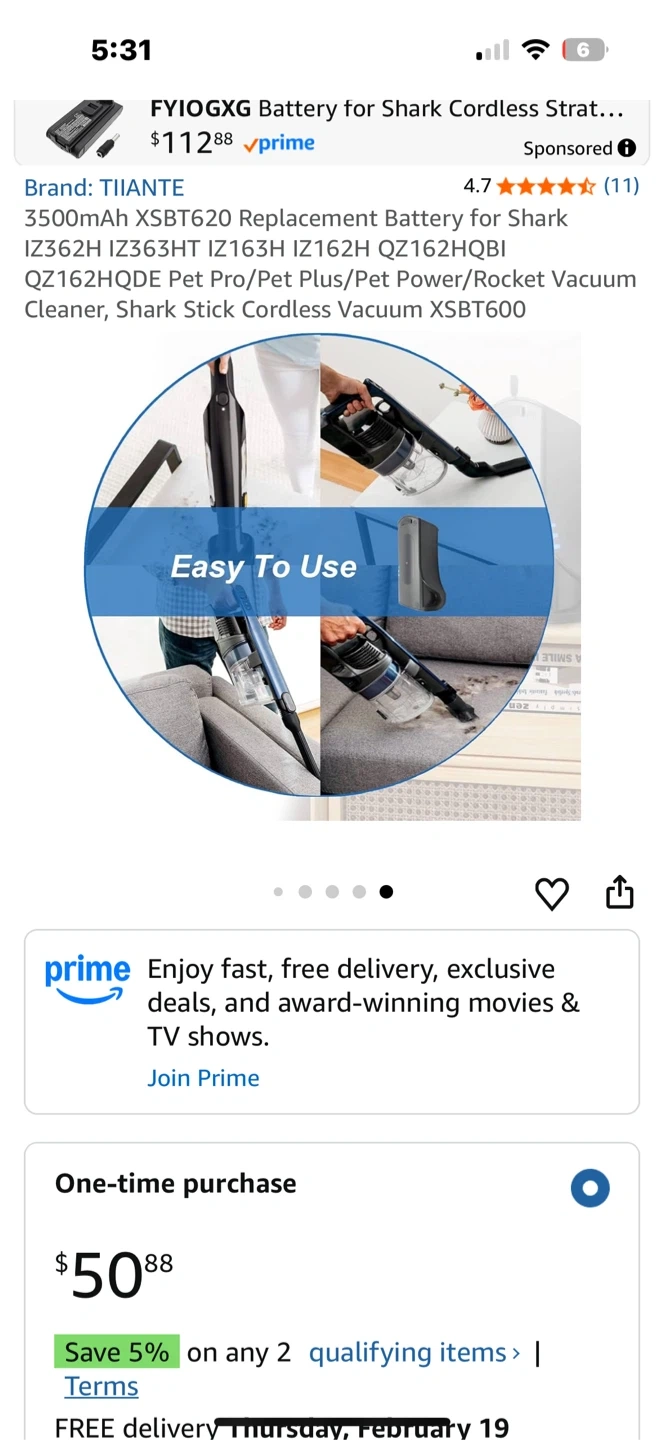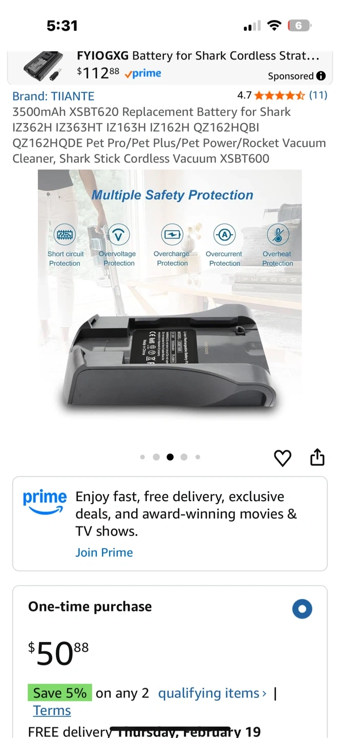 TIANTE π Li-ion Battery for Shark Cordless Vacuum XSB T600