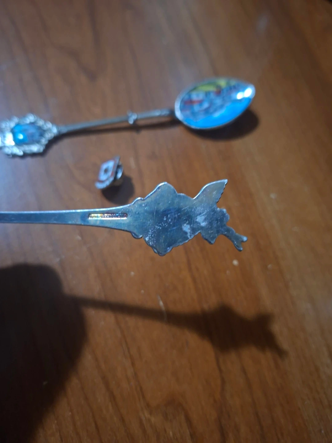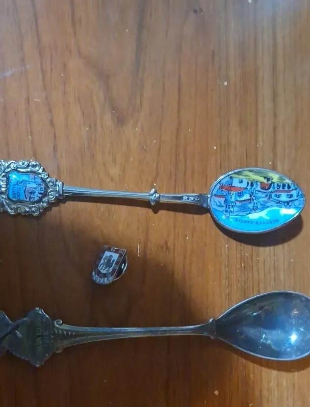 Two souvenir spoons featuring scenic designs. One spoon depicts 'Scotty's Castle' with intricate detailing on the handle. The other spoon displays a colourful architectural scene with a decorative handle. Includes a small pin with a crest.
