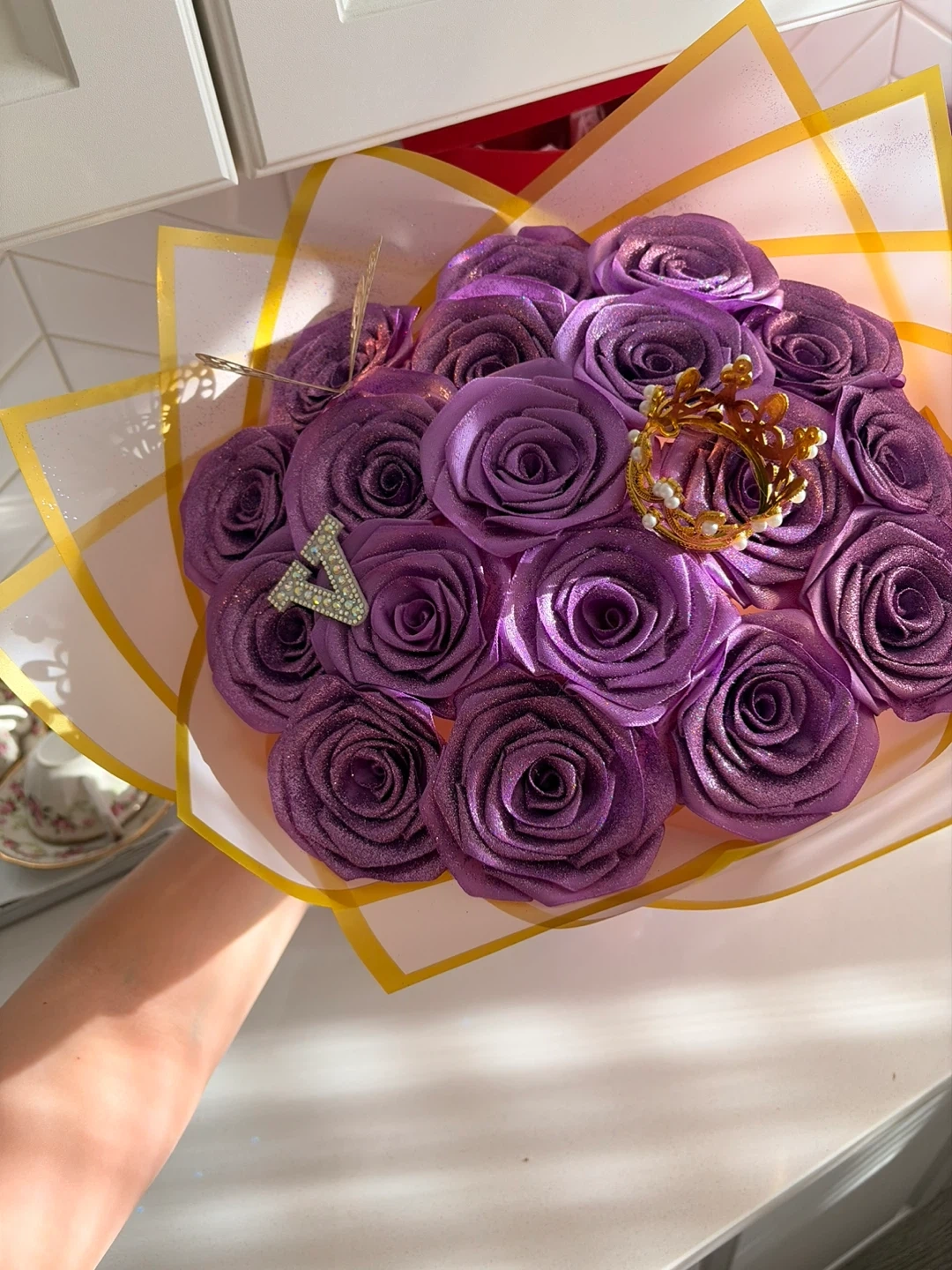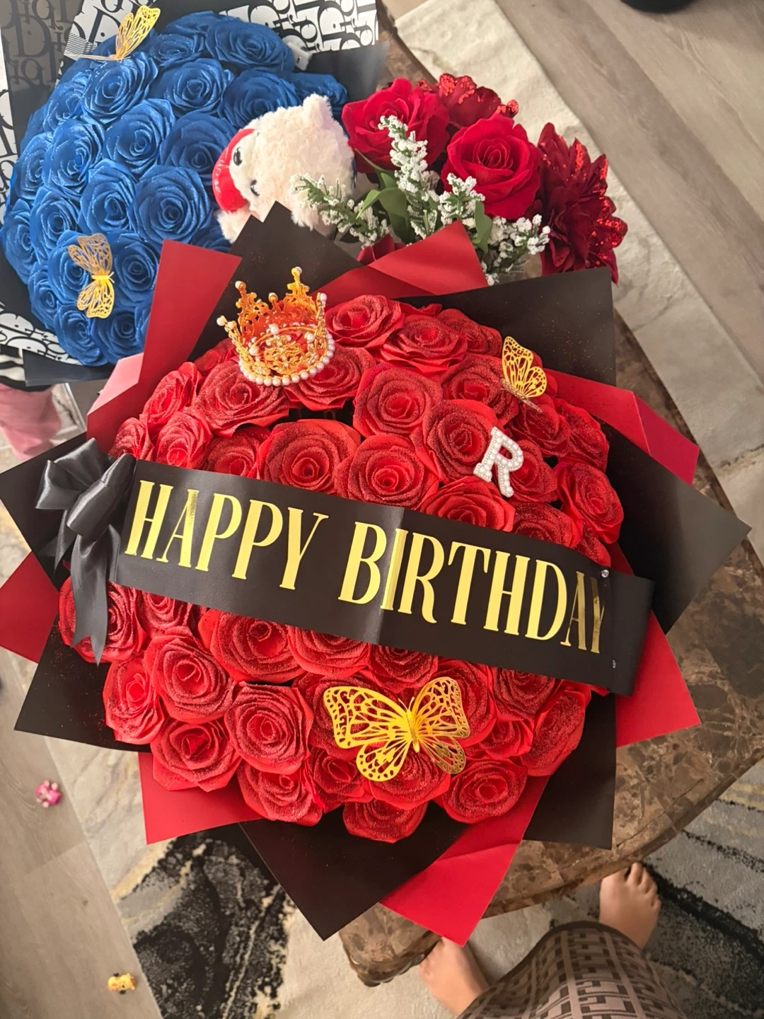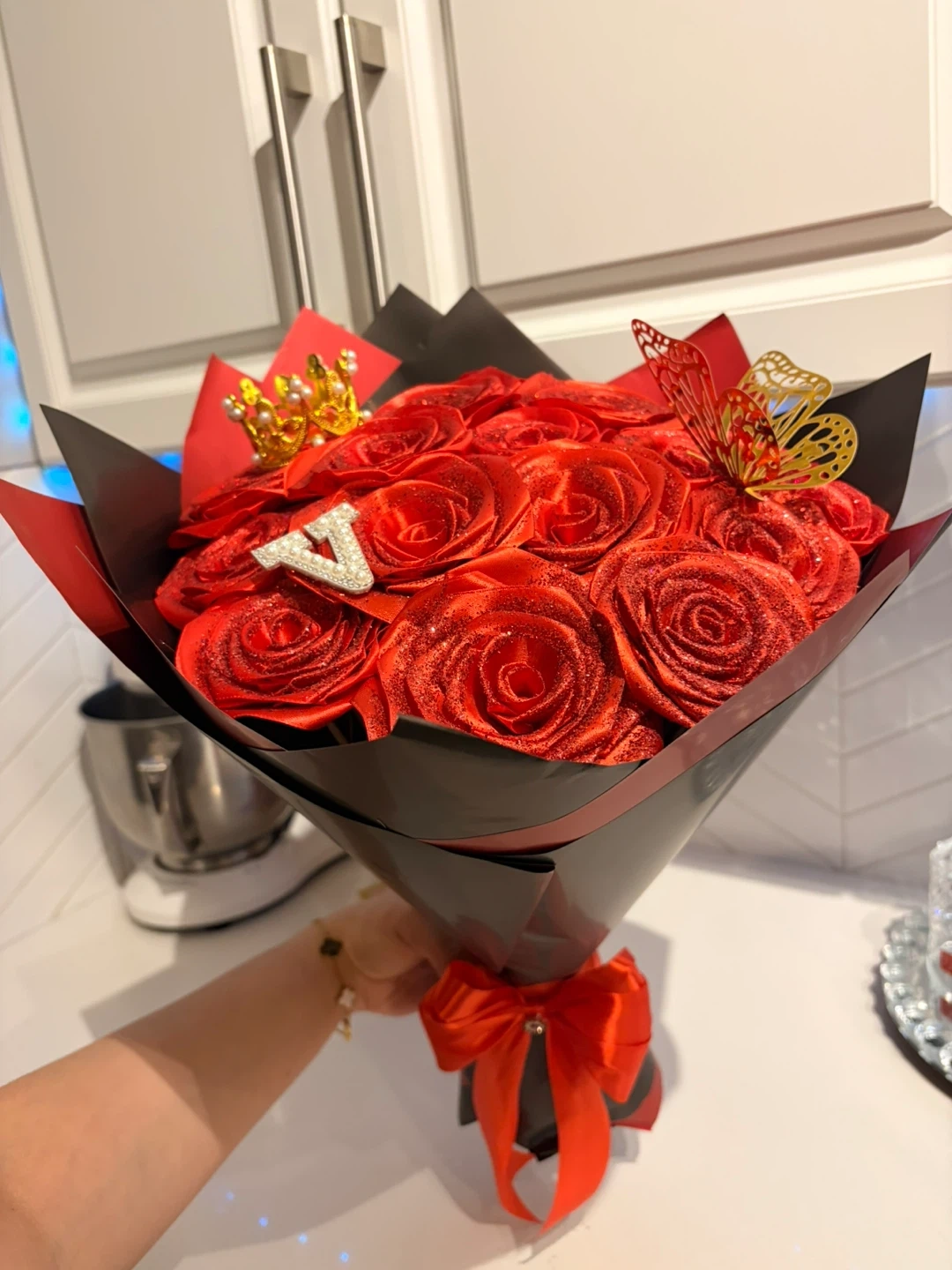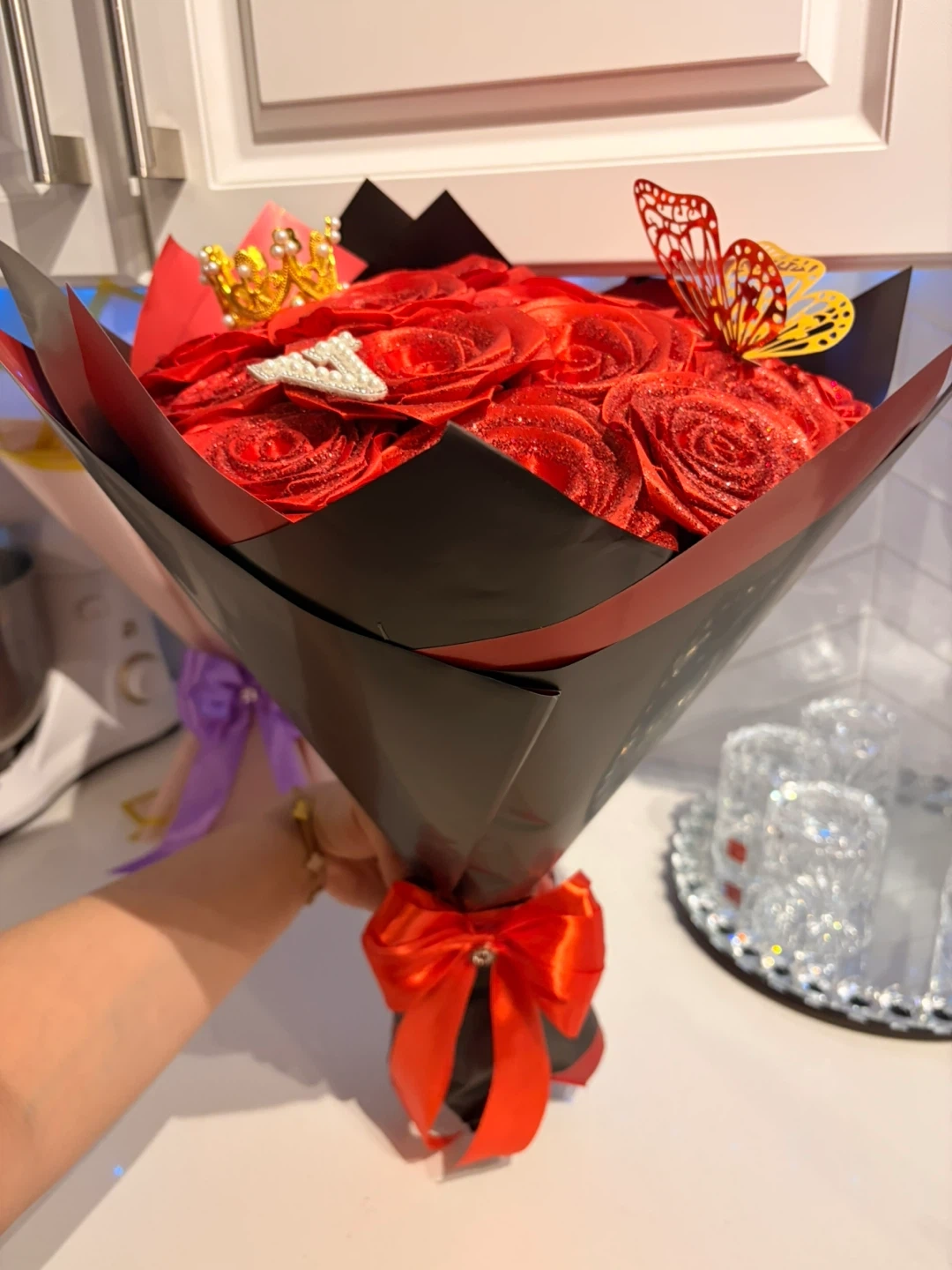 Selling these beautiful rose bouquets, perfect for birthdays or special occasions! They come decorated with a cute little crown and butterfly accents. Available in red, purple, and blue colours. They're sure to brighten up anyone's day!