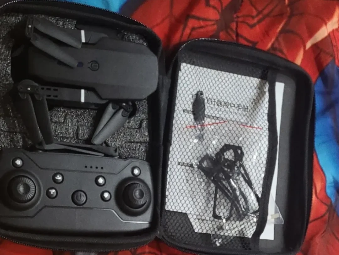 This foldable drone comes with a remote controller and a handy carrying case. It's easy to pack up and take with you for some aerial fun. The set includes the drone, controller, and a manual. Has some damage at the tab