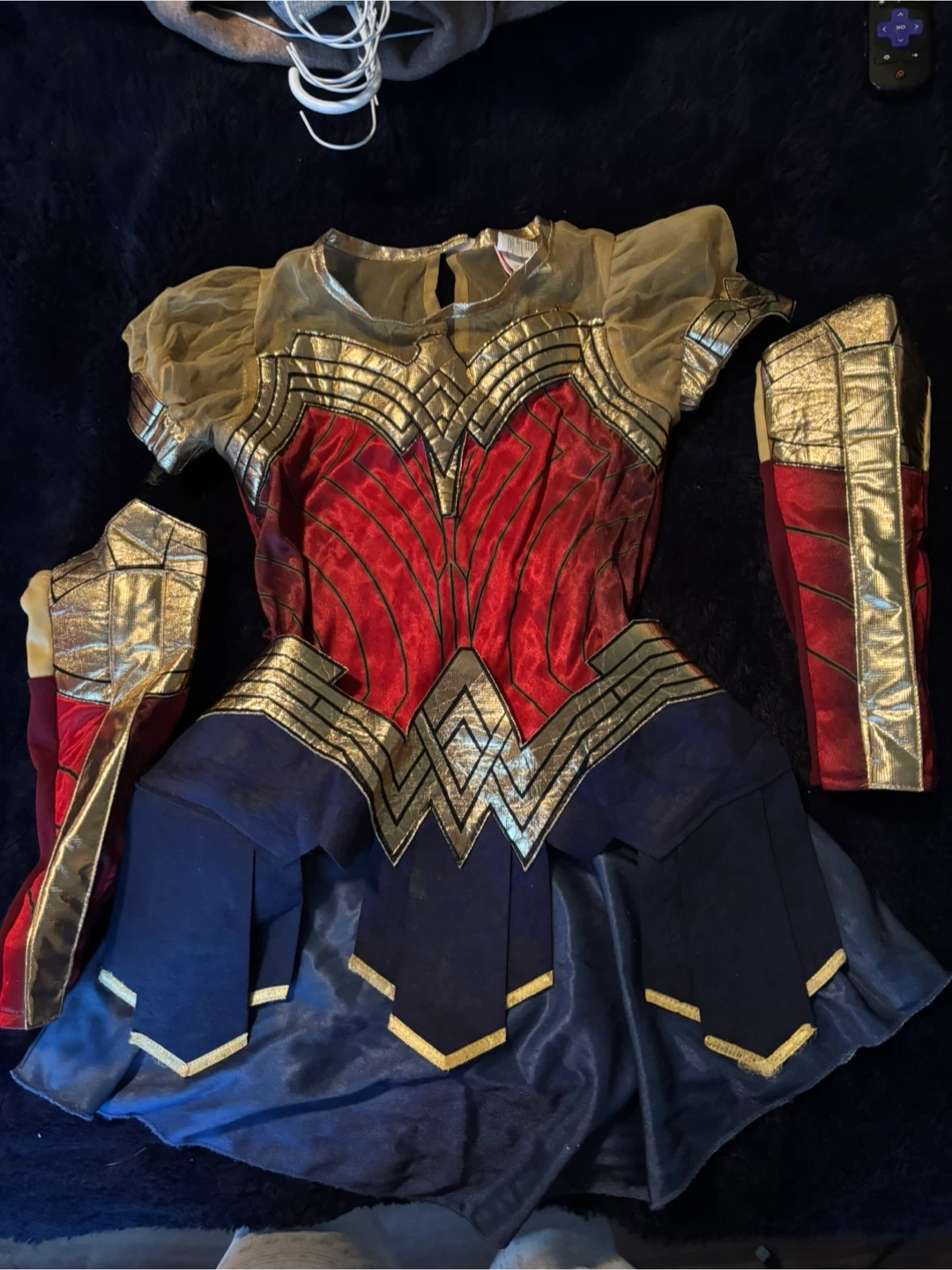 This is a Wonder Woman costume set for kids. It includes the main dress and arm cuffs. The costume features the iconic red, blue, and gold design. Perfect for dress-up playtime or Halloween!