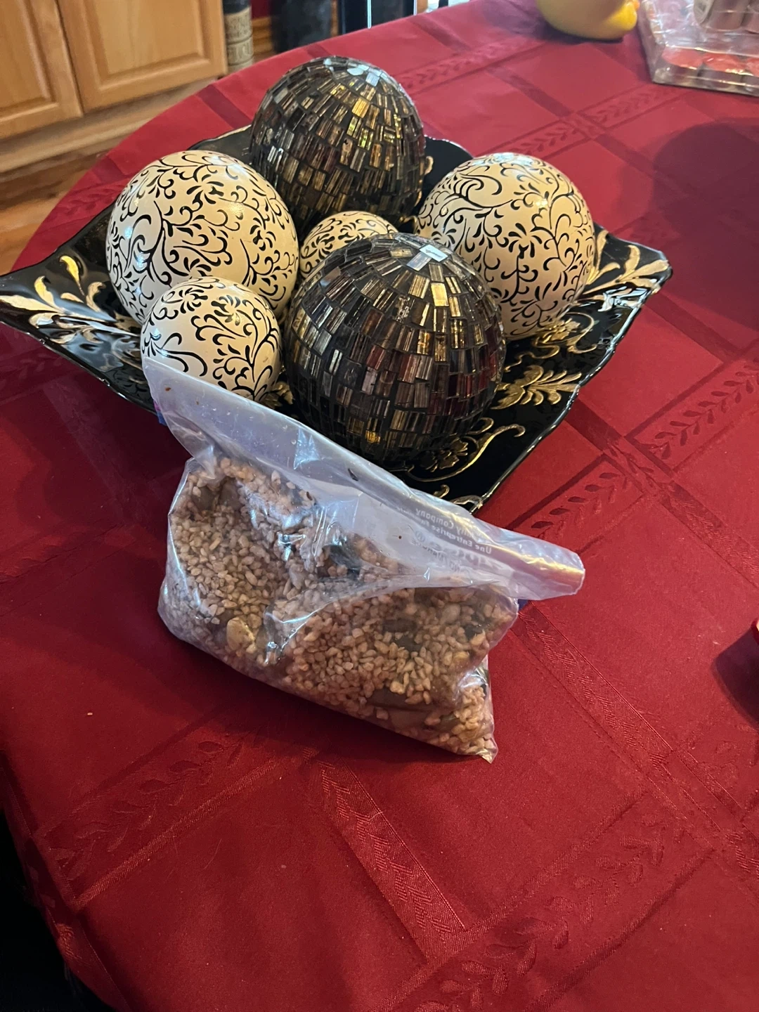 A set of five decorative spheres, featuring two mosaic-style and three with a black and white scroll design. They sit on a black and gold decorative tray. Perfect for adding a touch of style to any room! Asking $25.00