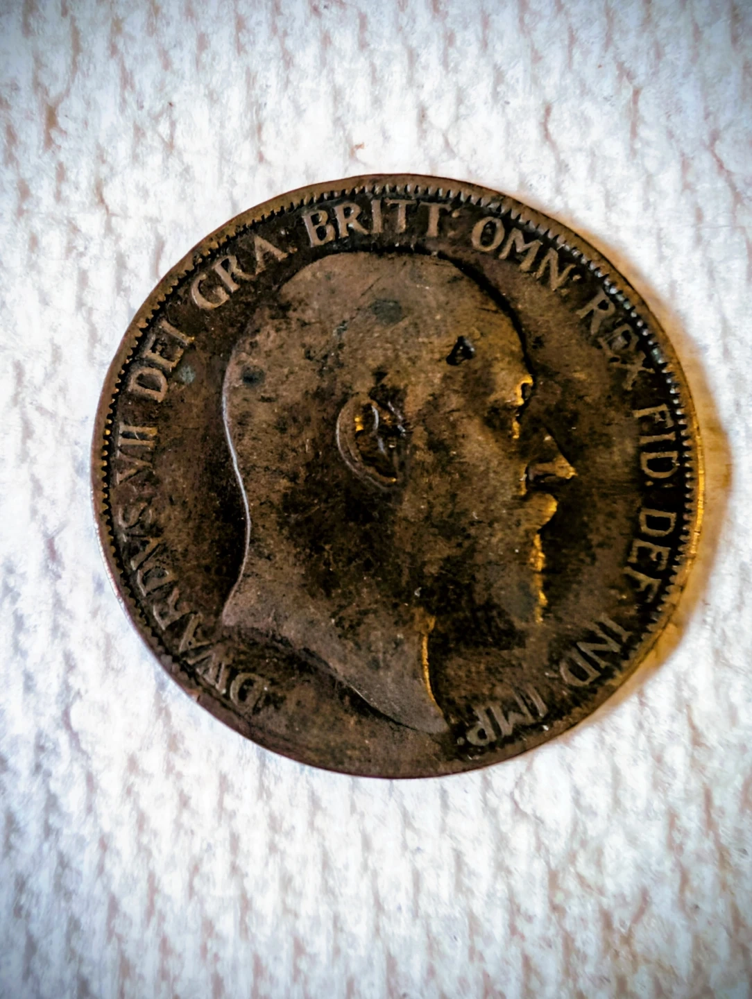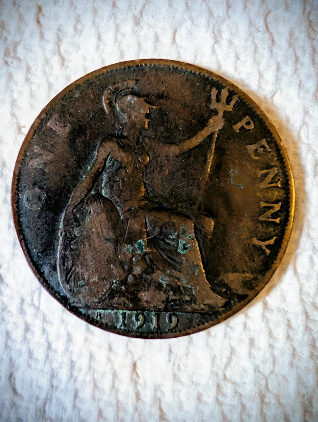 Three large Vintage British penny coins from 1902 - 1919 - 1967. Features King George V on one side and Britannia on the other. Made of copper alloy.