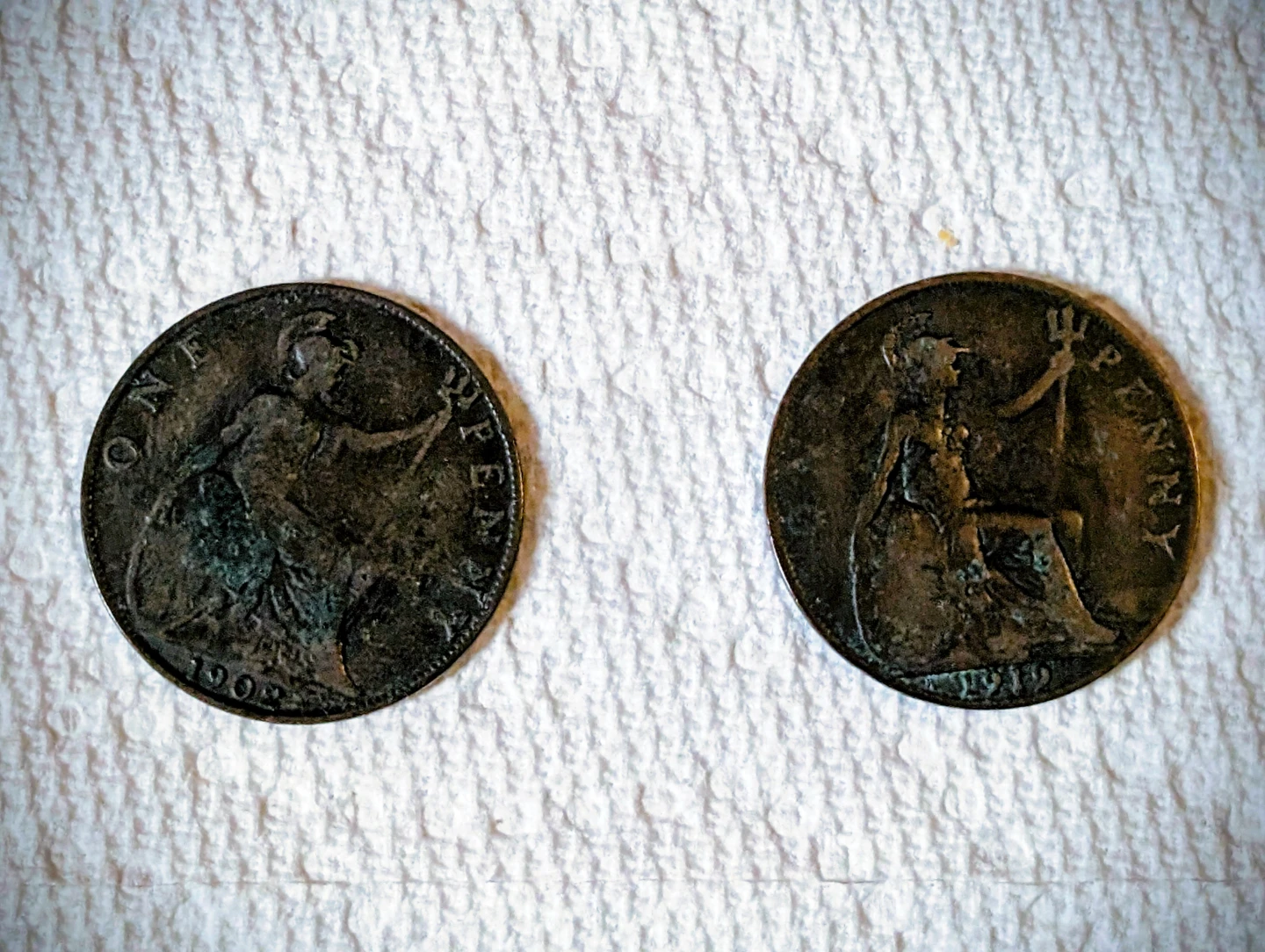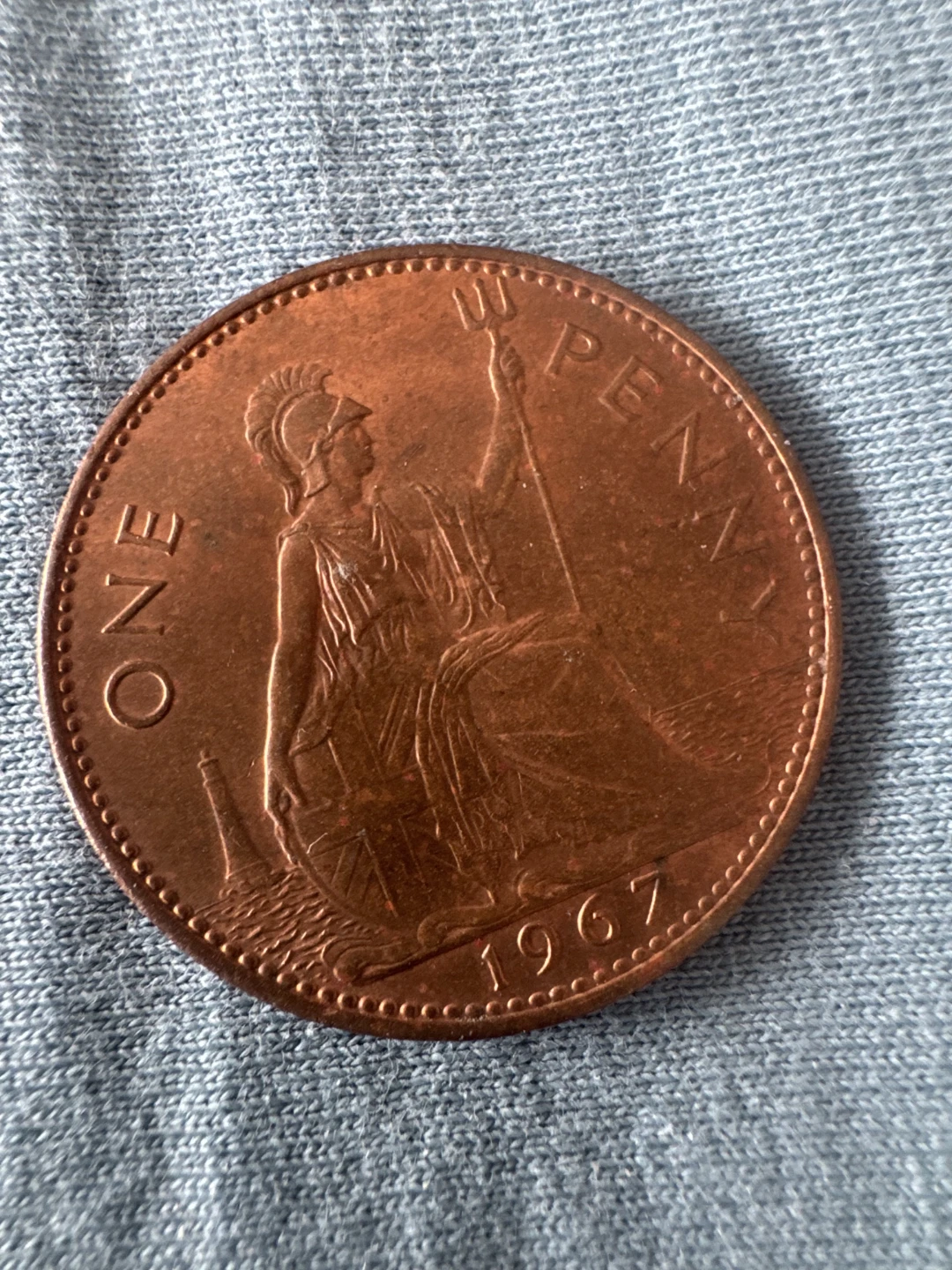 The 1967 penny has Queen Elizabeth with Brittannia.