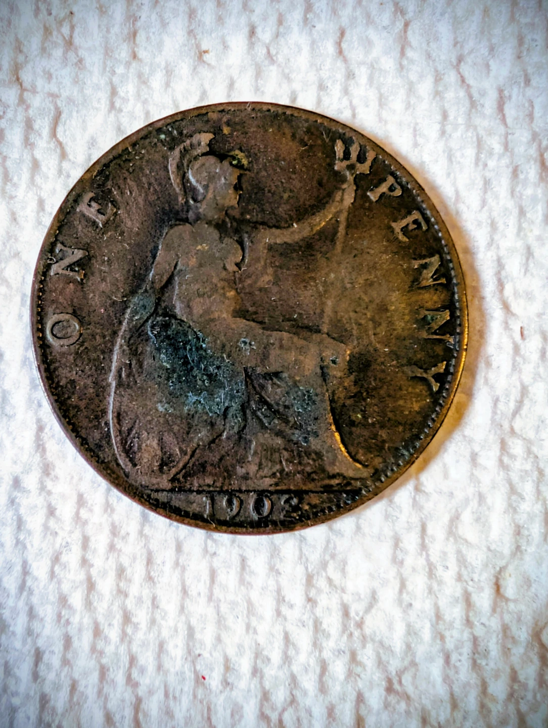 Three large Vintage British penny coins from 1902 - 1919 - 1967. Features King George V on one side and Britannia on the other. Made of copper alloy.