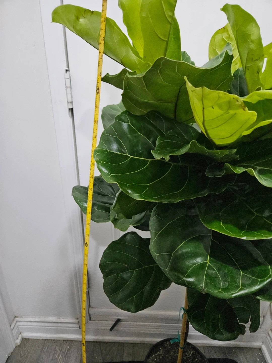 A tall fiddle leaf fig tree with large, dark green leaves and new bright green growth. It's staked for support and planted in a black pot. This plant stands roughly 5.5 feet tall. It's great for adding some greenery to your space!