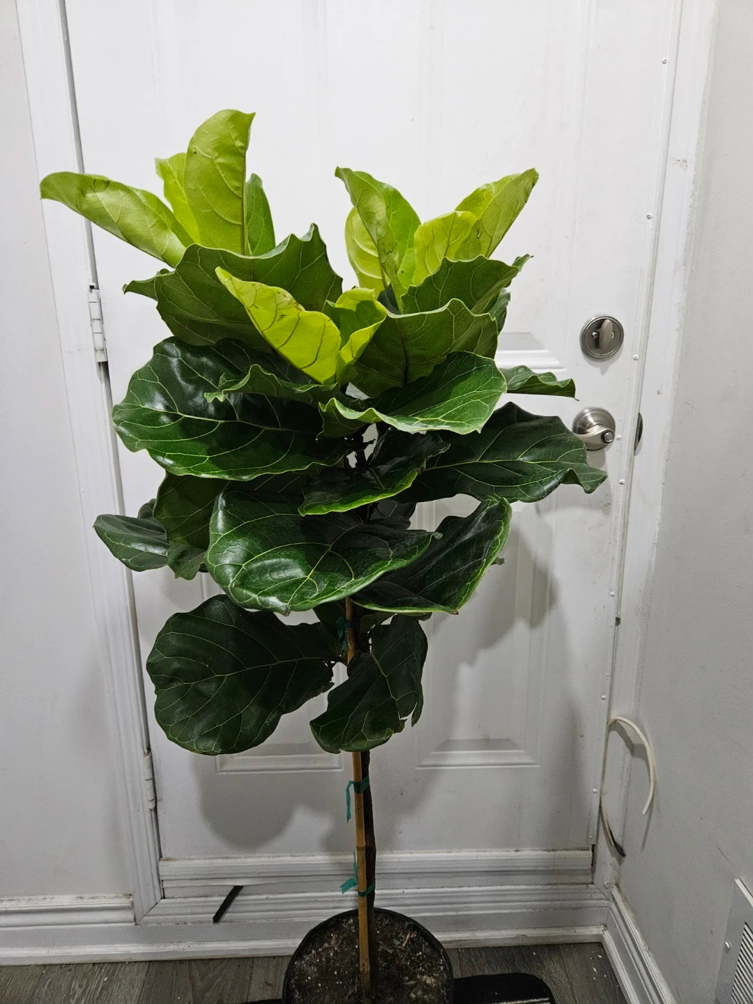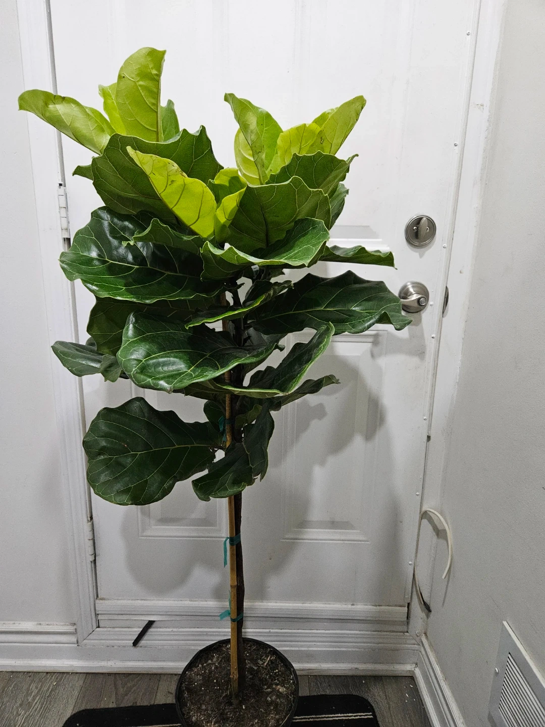 A tall fiddle leaf fig tree with large, dark green leaves and new bright green growth. It's staked for support and planted in a black pot. This plant stands roughly 5.5 feet tall. It's great for adding some greenery to your space!