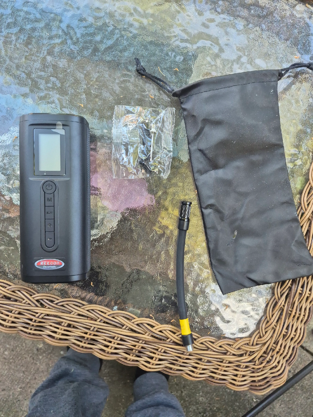 Selling a Reecon Clevertools portable air compressor! It comes with a carrying bag and various attachments for different types of inflatables. It's in great condition and ready to use for your car tires, bike tires, or sports equipment