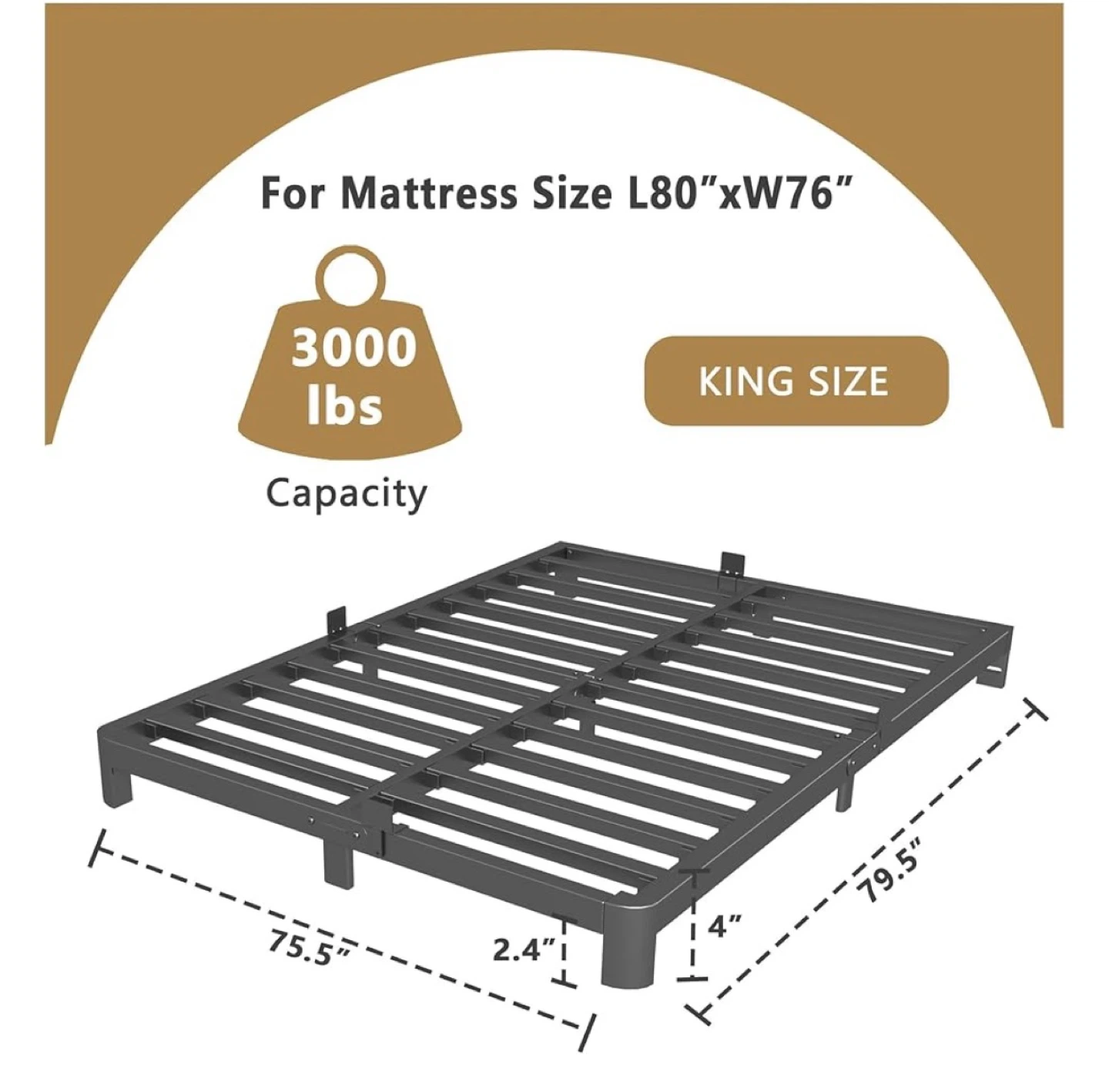 This king size metal bed frame supports up to 3000 lbs and doesn't require a box spring. It's designed for mattresses up to 80" x 76". The frame has a low profile with 4" clearance.