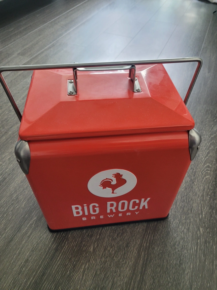 Big Rock Brewery metal cooler with a silver metal handle. Excellent for keeping drinks cold. Perfect for picnics or camping.