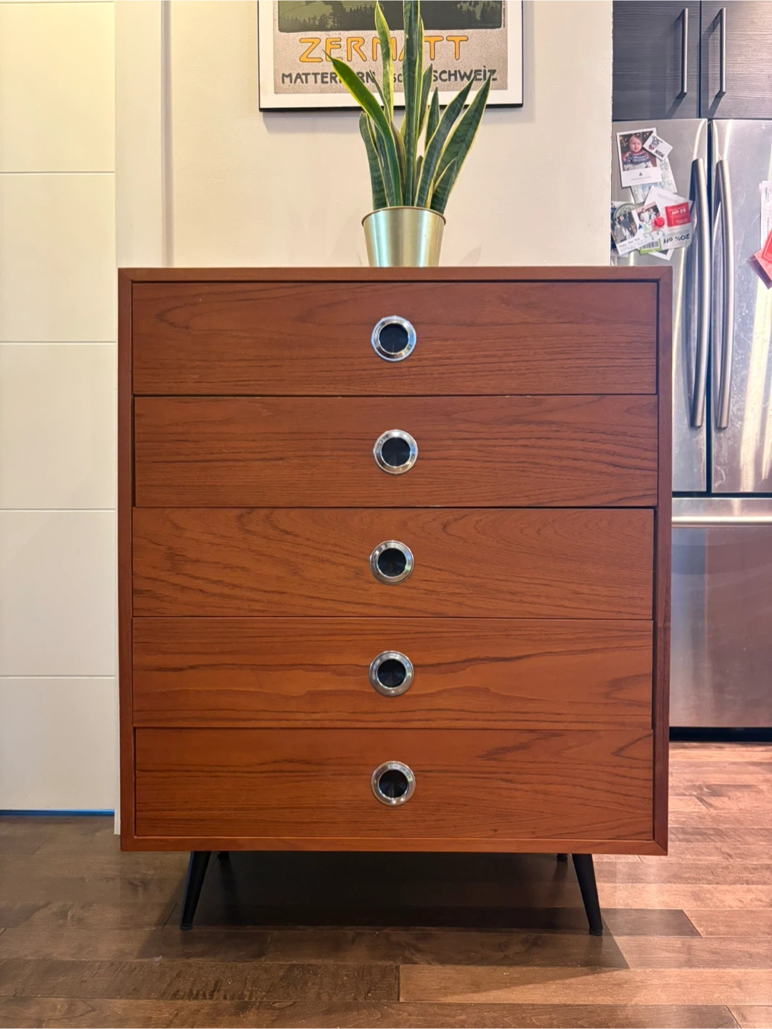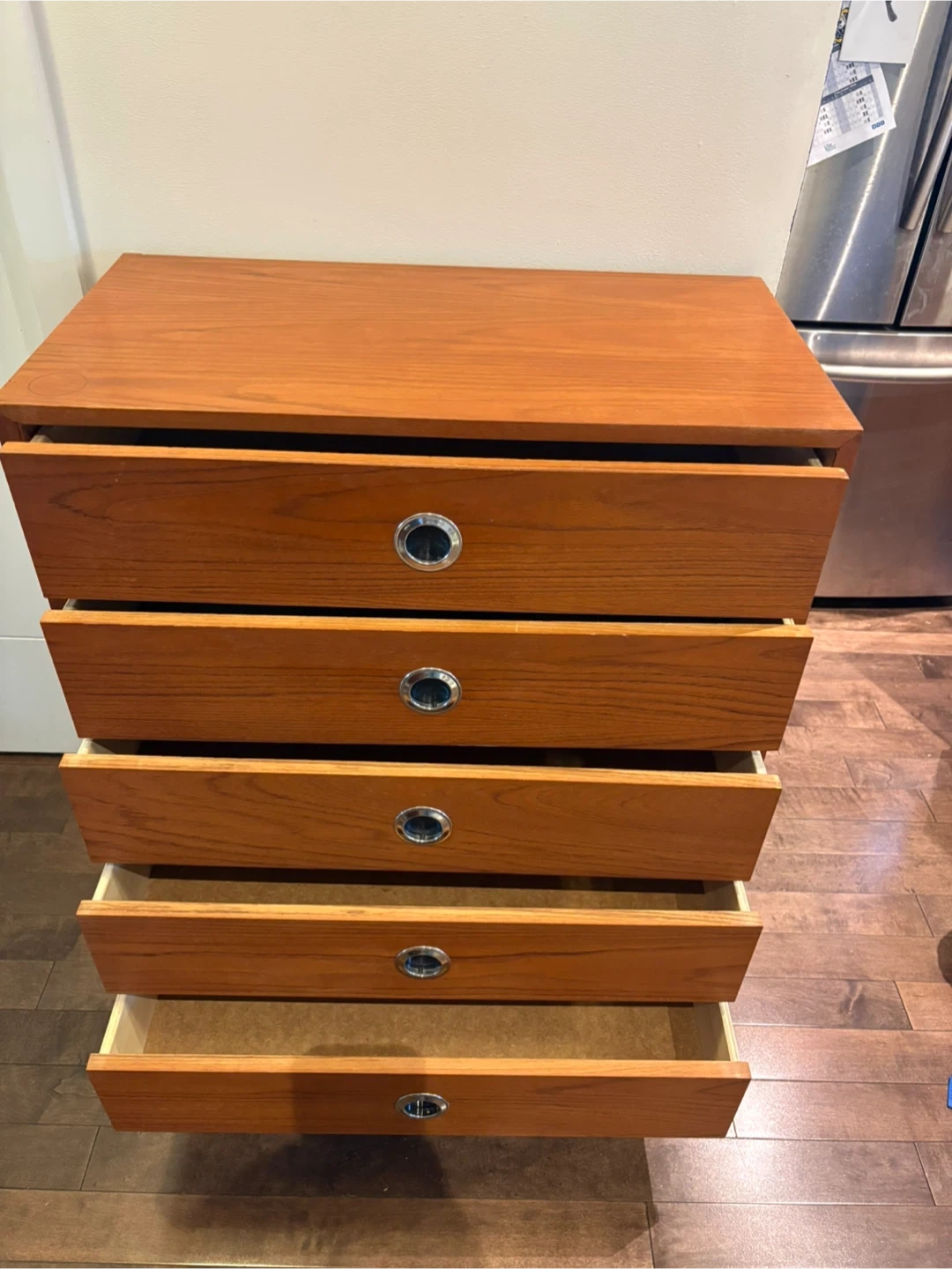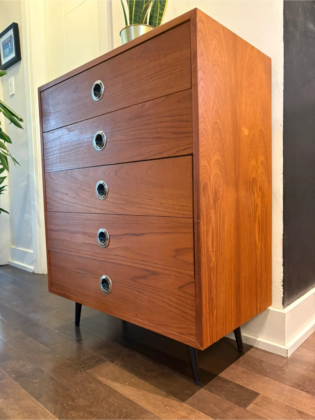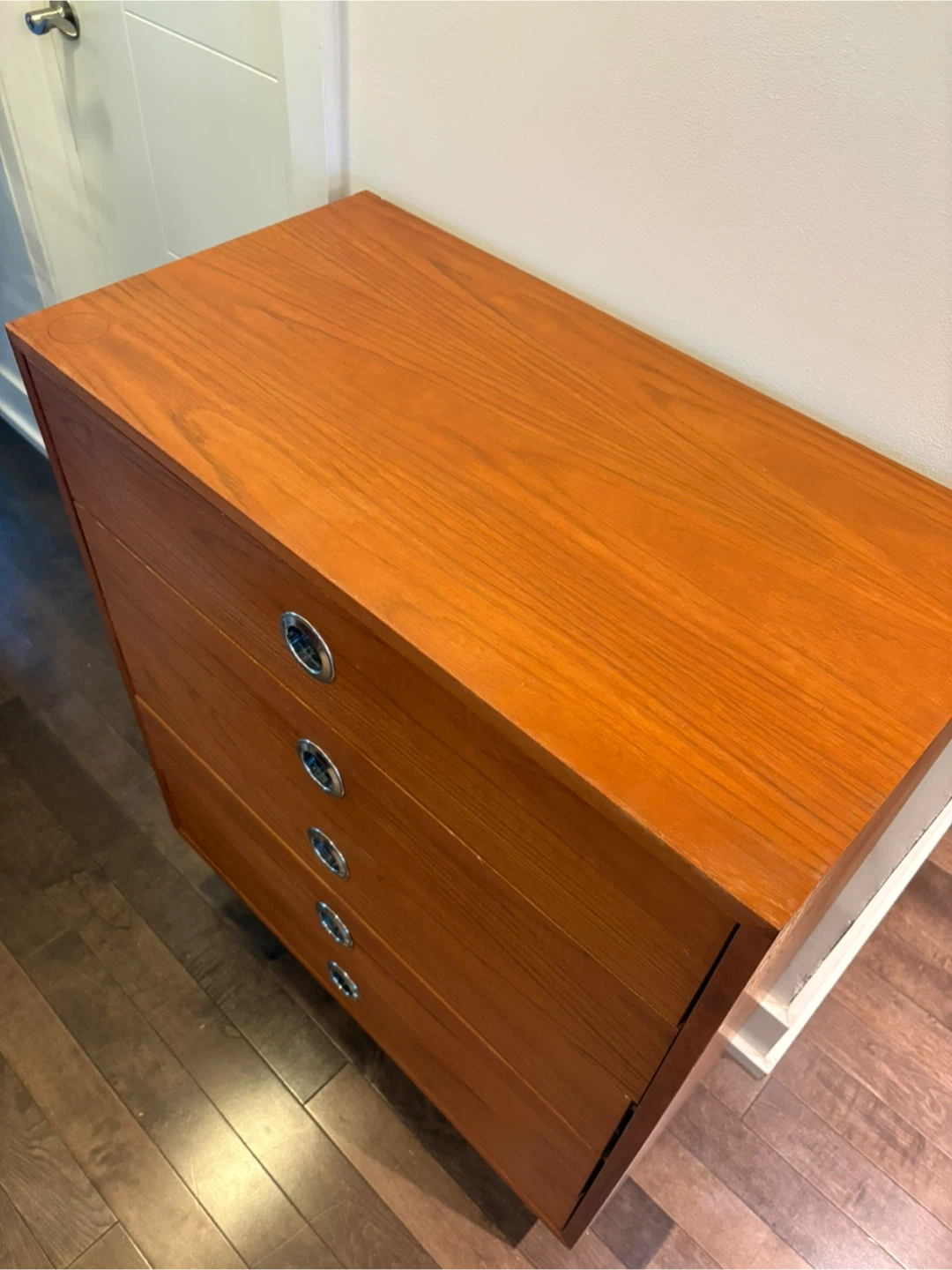 Teak dresser with a simple, clean design. Five drawers that offer ample storage without taking up a lot of space. Shows some age appropriate wear and tear, but overall in good vintage condition. Sturdy and well cared for—great for a bedroom, hallway, or office.