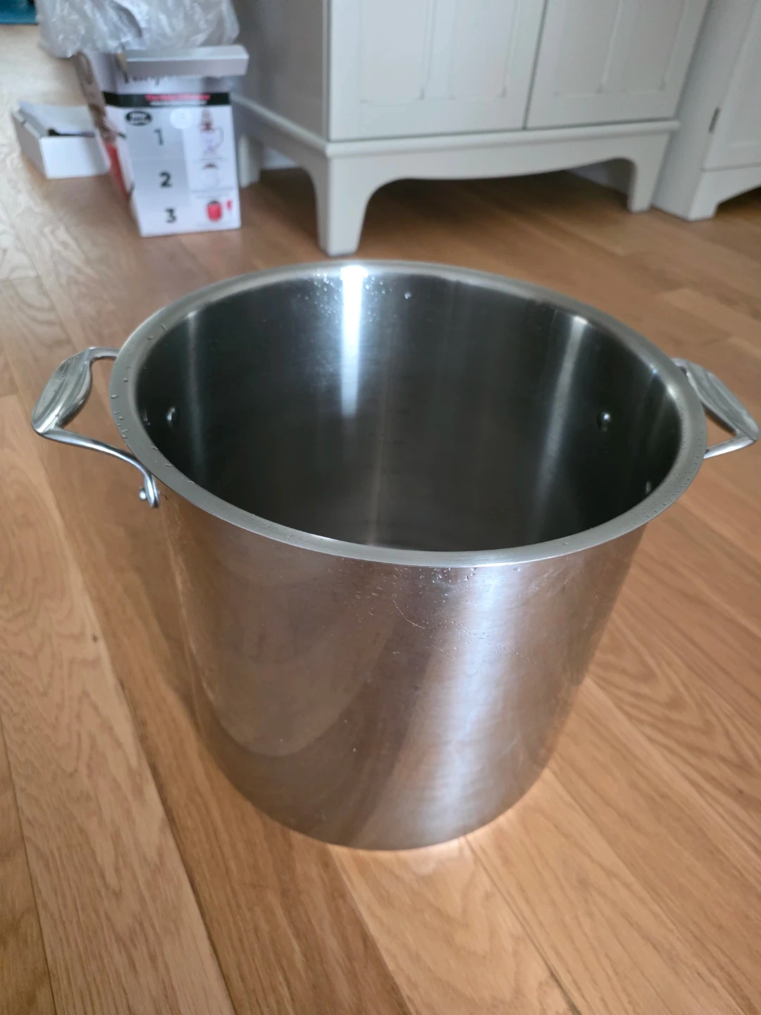 Selling a Bergner 15.1 L stock pot with lid. It's made of stainless steel and is in great condition. The box is included!