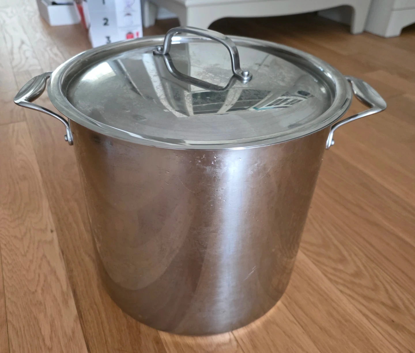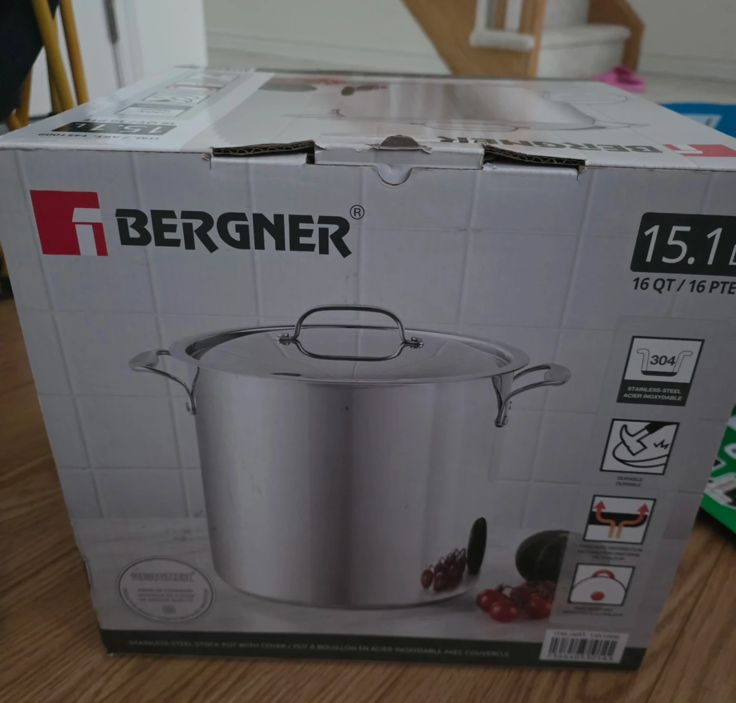 Selling a Bergner 15.1 L stock pot with lid. It's made of stainless steel and is in great condition. The box is included!