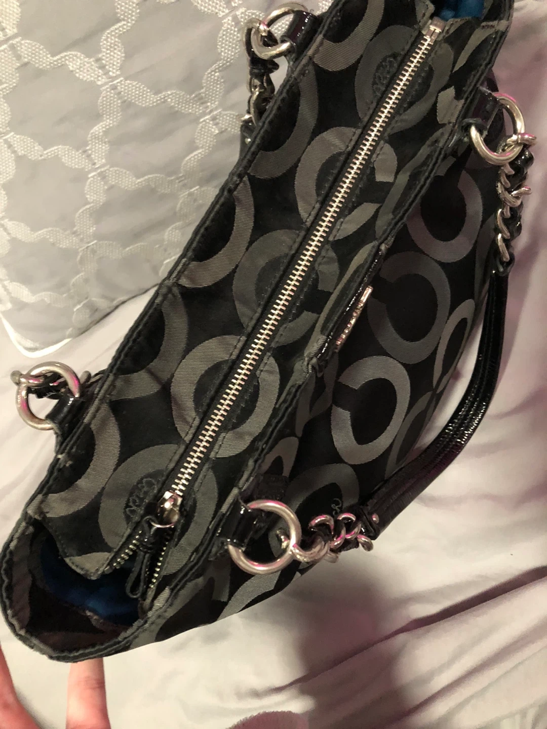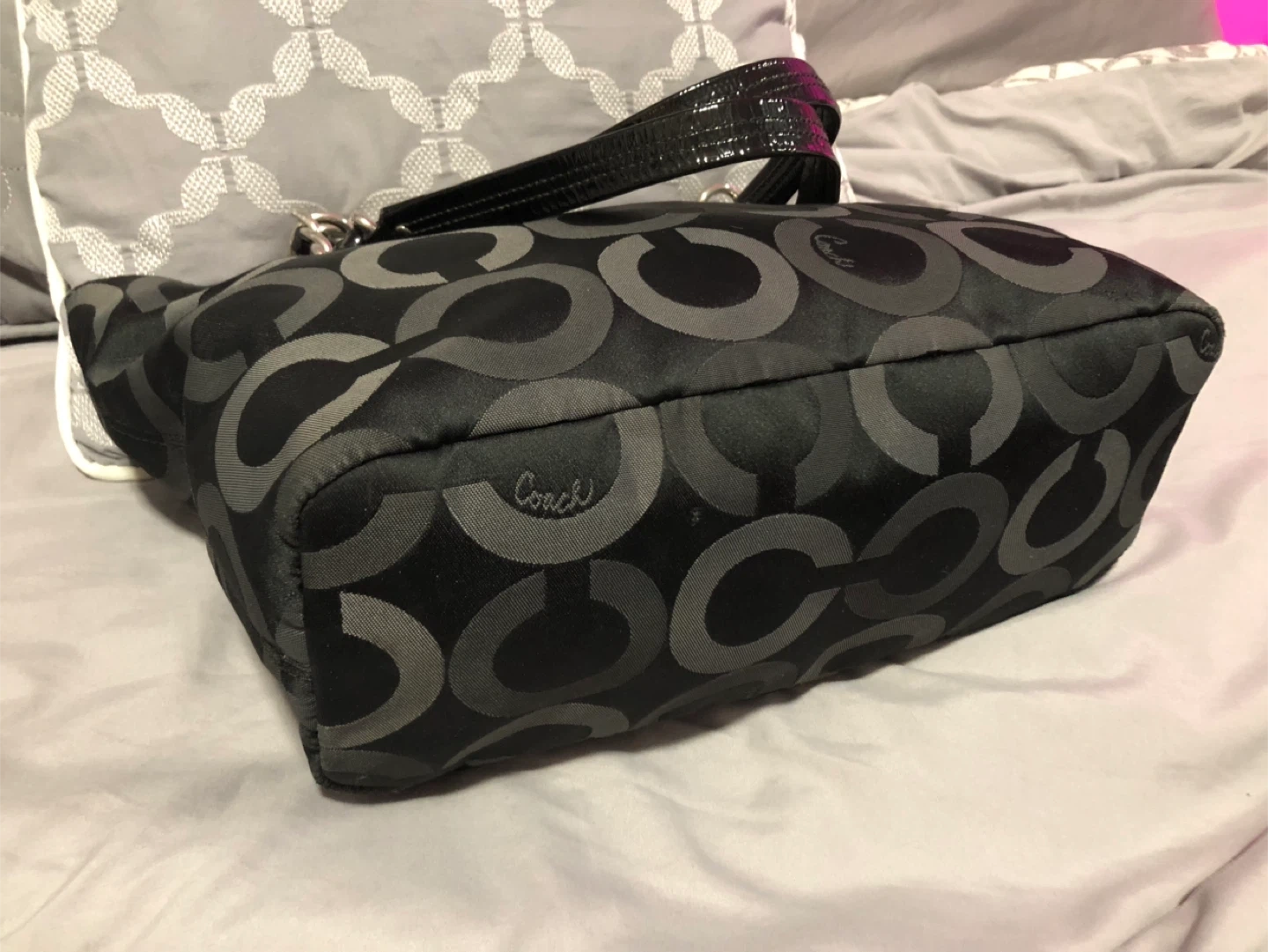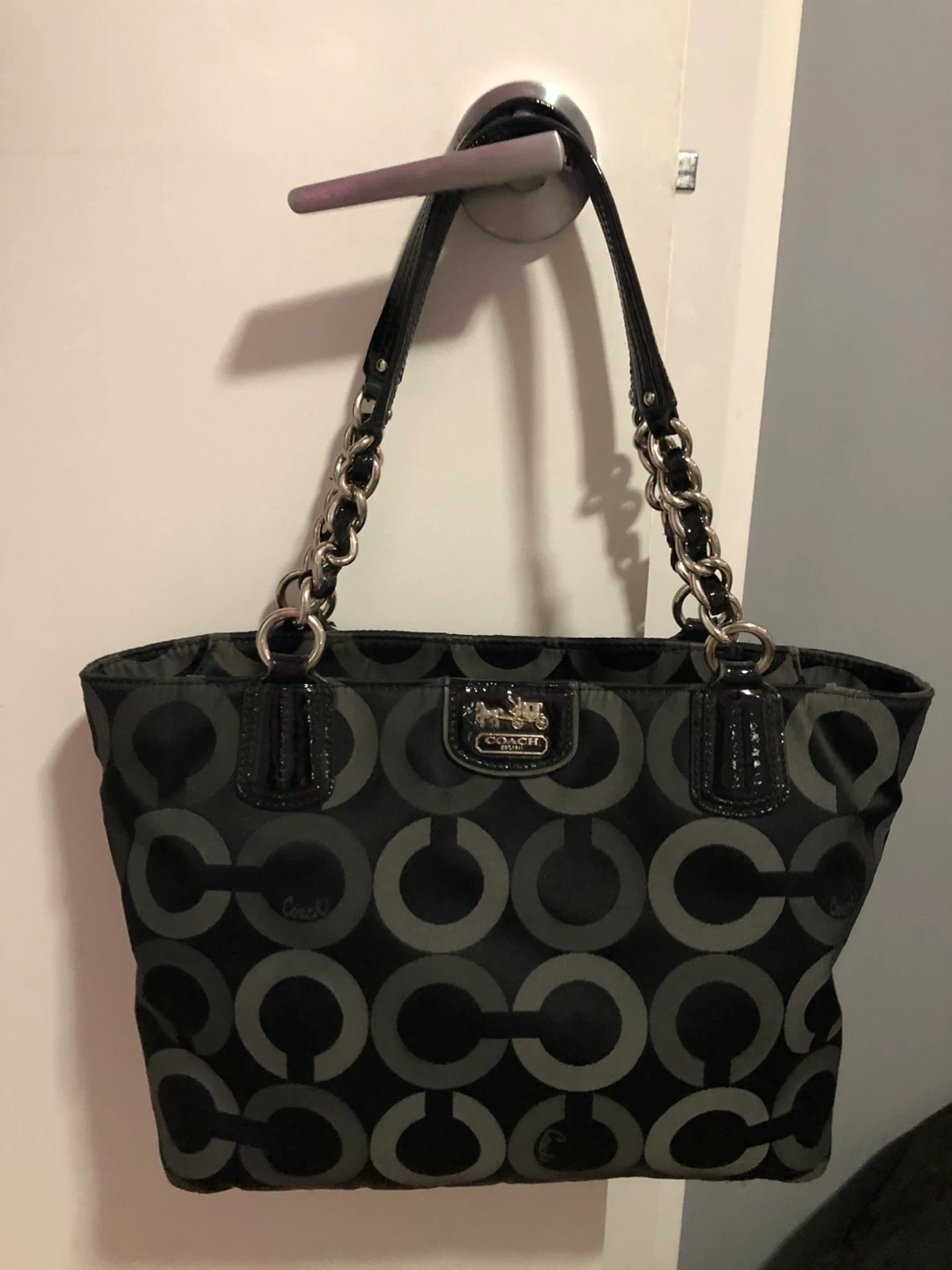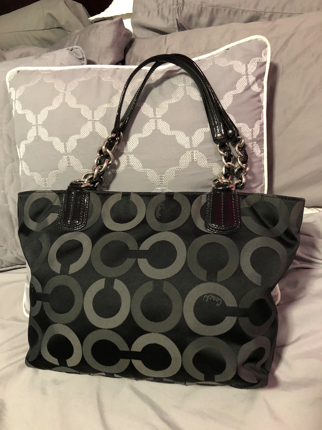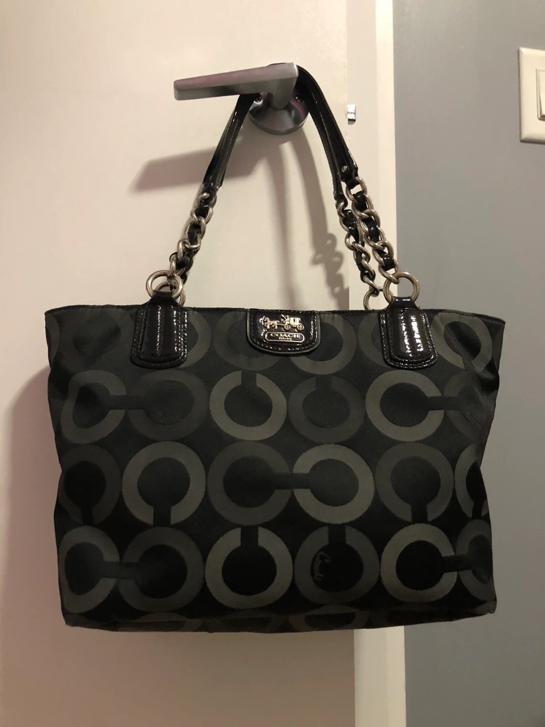 This is a stylish Coach tote bag in black with the signature pattern. It features patent leather accents and silver chain detailing on the straps. The interior is spacious for everyday essentials.